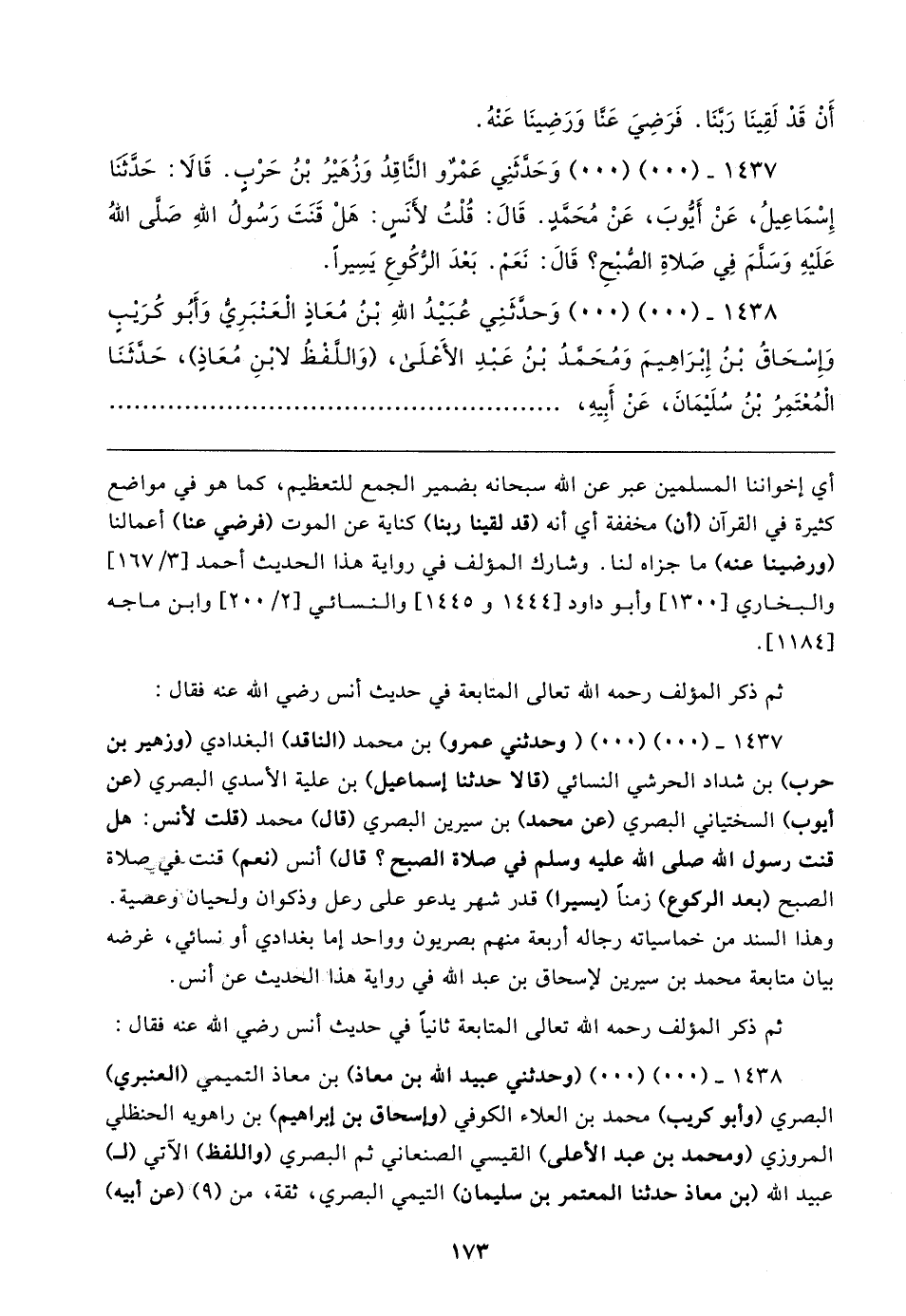 ١٤٣٧ - (. . .) (. . .) (وحدثني عمرو) بن محمَّد (الناقد) البغدادي (وزهير بن حرب) بن شداد الحرشي النسائي (قالا حدثنا إسماعيل) بن علية الأسدي البصري (عن أيوب) السختياني البصري (عن محمَّد) بن سيرين البصري (قال) محمَّد (قلت لأنس: هل قنت رسول الله - صلى الله عليه وسلم - في صلاة الصبح؟ قال) أنس (نعم) قنت في صلاة الصبح (بعد الركوع) زمنًا (يسيرا) قدر شهر يدعو على رعل وذكوان ولحيان وعصية. وهذا السند من خماسياته رجاله أربعة منهم بصريون وواحد إما بغدادي أو نسائي، غرضه بيان متابعة محمَّد بن سيرين لإسحاق بن عبد الله في رواية هذا الحديث عن أنس.