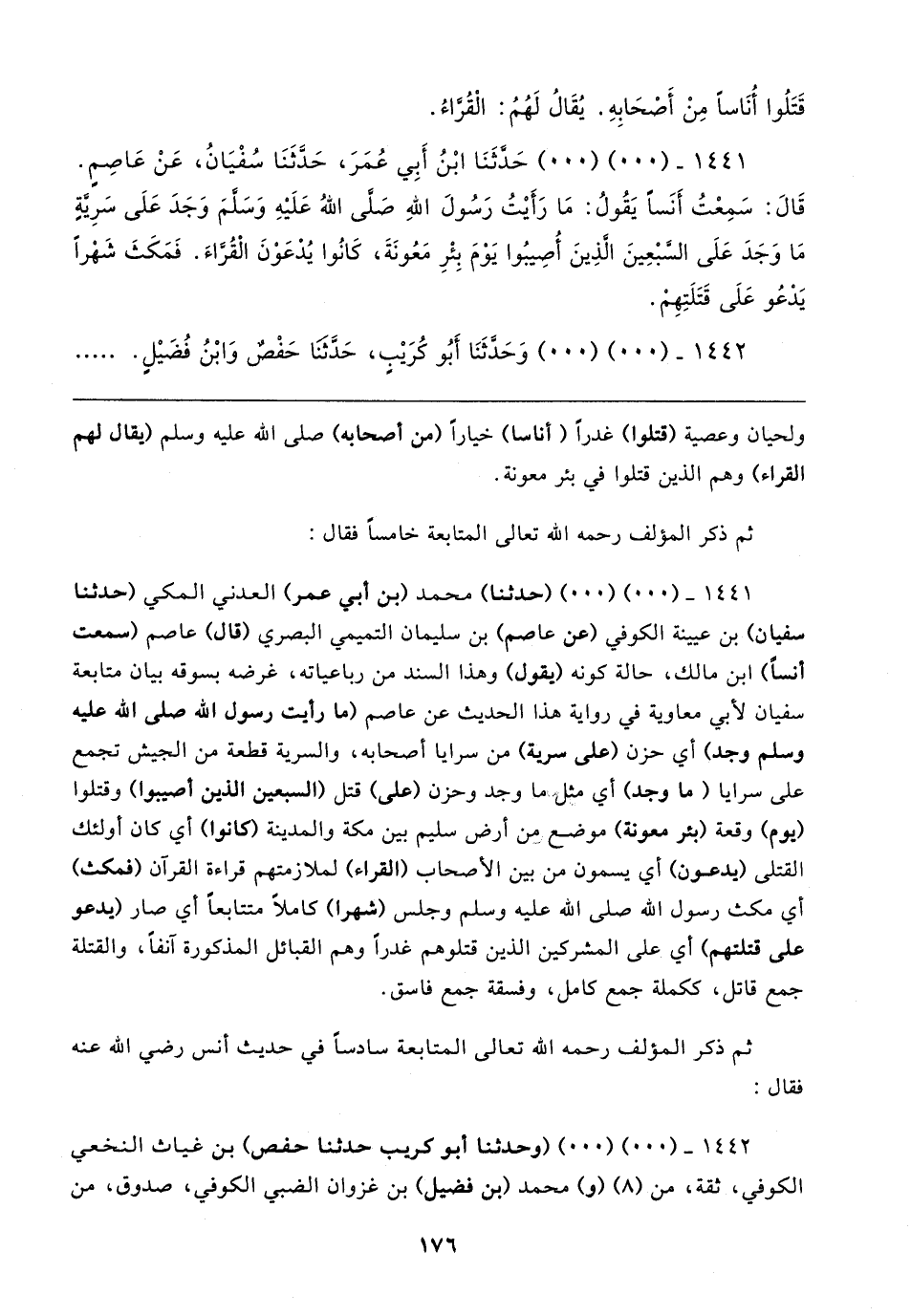 ١٤٤١ - (. . .) (. . .) (حدثنا) محمَّد (بن أبي عمر) العدني المكي (حدثنا سفيان) بن عيينة الكوفي (عن عاصم) بن سليمان التميمي البصري (قال) عاصم (سمعت أنسًا) ابن مالك، حالة كونه (يقول) وهذا السند من رباعياته، غرضه بسوقه بيان متابعة سفيان لأبي معاوية في رواية هذا الحديث عن عاصم (ما رأيت رسول الله - صلى الله عليه وسلم - وجد) أي حزن (على سرية) من سرايا أصحابه، والسرية قطعة من الجيش تجمع على سرايا (ما وجد) أي مثل ما وجد وحزن (على) قتل (السبعين الذين أصيبوا) وقتلوا (يوم) وقعة (بئر معونة) موضع من أرض سليم بين مكة والمدينة (كانوا) أي كان أولئك القتلى (يدعون) أي يسمون من بين الأصحاب (القراء) لملازمتهم قراءة القرآن (فمكث) أي مكث رسول الله - صلى الله عليه وسلم - وجلس (شهرا) كاملًا متتابعًا أي صار (يدعو على قتلتهم) أي على المشركين الذين قتلوهم غدرًا وهم القبائل المذكورة آنفًا، والقتلة جمع قاتل، ككملة جمع كامل، وفسقة جمع فاسق.