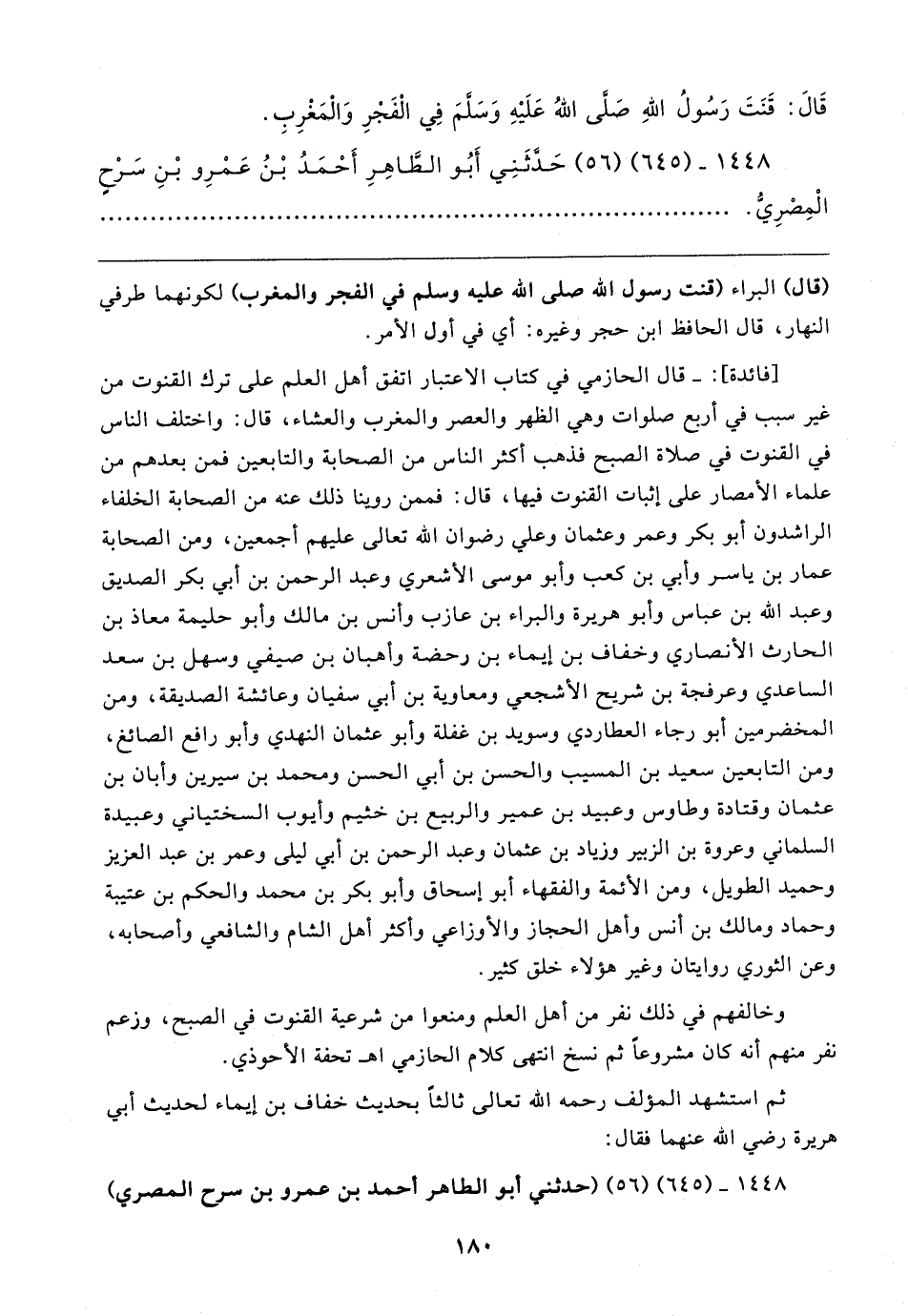 [فائدة]: - قال الحازمي في كتاب الاعتبار اتفق أهل العلم على ترك القنوت من غير سبب في أربع صلوات وهي الظهر والعصر والمغرب والعشاء، قال: واختلف الناس في القنوت في صلاة الصبح فذهب أكثر الناس من الصحابة والتابعين فمن بعدهم من علماء الأمصار على إثبات القنوت فيها، قال: فممن روينا ذلك عنه من الصحابة الخلفاء الراشدون أبو بكر وعمر وعثمان وعلي رضوان الله تعالى عليهم أجمعين، ومن الصحابة عمار بن ياسر وأبي بن كعب وأبو موسى الأشعري وعبد الرحمن بن أبي بكر الصديق وعبد الله بن عباس وأبو هريرة والبراء بن عازب وأنس بن مالك وأبو حليمة معاذ بن الحارث الأنصاري وخفاف بن إيماء بن رحضة وأهبان بن صيفي وسهل بن سعد الساعدي وعرفجة بن شريح الأشجعي ومعاوية بن أبي سفيان وعائشة الصديقة، ومن المخضرمين أبو رجاء العطاردي وسويد بن غفلة وأبو عثمان النهدي وأبو رافع الصائغ، ومن التابعين سعيد بن المسيب والحسن بن أبي الحسن ومحمد بن سيرين وأبان بن عثمان وقتادة وطاوس وعبيد بن عمير والربيع بن خثيم وأيوب السختياني وعبيدة السلماني وعروة بن الزبير وزياد بن عثمان وعبد الرحمن بن أبي ليلى وعمر بن عبد العزيز وحميد الطويل، ومن الأئمة والفقهاء أبو إسحاق وأبو بكر بن محمَّد والحكم بن عتيبة وحماد ومالك بن أنس وأهل الحجاز والأوزاعي وأكثر أهل الشام والشافعيُّ وأصحابه، وعن الثوري روايتان وغير هؤلاء خلق كثير.