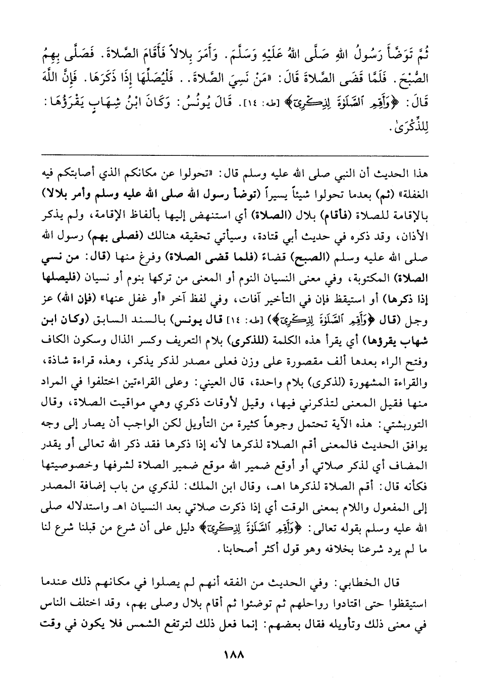 هذا الحديث أن النبي - صلى الله عليه وسلم - قال: "تحولوا عن مكانكم الذي أصابتكم فيه الغفلة" (ثمَّ) بعدما تحولوا شيئًا يسيرًا (توضأ رسول الله - صلى الله عليه وسلم - وأمر بلالا) بالإقامة للصلاة (فأقام) بلال (الصلاة) أي استنهض إليها بألفاظ الإقامة، ولم يذكر الأذان، وقد ذكره في حديث أبي قتادة، وسيأتي تحقيقه هنالك (فصلى بهم) رسول الله - صلى الله عليه وسلم - (الصبح) قضاءً (فلما قضى الصلاة) وفرغ منها (قال: من نسي الصلاة) المكتوبة، وفي معنى النسيان النوم أو المعنى من تركها بنوم أو نسيان (فليصلها إذا ذكرها) أو استيقظ فإن في التأخير آفات، وفي لفظ آخر "أو غفل عنها" (فإن الله) - عز وجل - (قال {وَأَقِمِ الصَّلَاةَ لِذِكْرِي}) [طه: ١٤] قال يونس) بالسند السابق (وكان ابن شهاب يقرؤها) أي يقرأ هذه الكلمة (للذكرى) بلام التعريف وكسر الذال وسكون الكاف وفتح الراء بعدها ألف مقصورة على وزن فعلى مصدر لذكر يذكر، وهذه قراءة شاذة، والقراءة المشهورة (لذكرى) بلام واحدة، قال العيني: وعلى القراءتين اختلفوا في المراد منها فقيل المعنى لتذكرني فيها، وقيل لأوقات ذكري وهي مواقيت الصلاة، وقال التوربشتي: هذه الآية تحتمل وجوهًا كثيرة من التأويل لكن الواجب أن يصار إلى وجه يوافق الحديث فالمعنى أقم الصلاة لذكرها لأنه إذا ذكرها فقد ذكر الله تعالى أو يقدر المضاف أي لذكر صلاتي أو أوقع ضمير الله موقع ضمير الصلاة لشرفها وخصوصيتها فكأنه قال: أقم الصلاة لذكرها اهـ، وقال ابن الملك: لذكري من باب إضافة المصدر إلى المفعول واللام بمعنى الوقت أي إذا ذكرت صلاتي بعد النسيان اهـ واستدلاله - صلى الله عليه وسلم - بقوله تعالى: {وَأَقِمِ الصَّلَاةَ لِذِكْرِي} دليل على أن شرع من قبلنا شرع لنا ما لم يرد شرعنا بخلافه وهو قول أكثر أصحابنا.