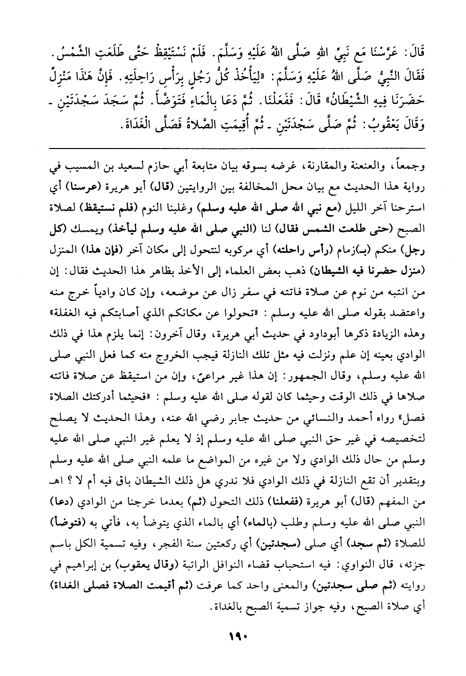 وجمعًا، والعنعنة والمقارنة، غرضه بسوقه بيان متابعة أبي حازم لسعيد بن المسيب في رواية هذا الحديث مع بيان محل المخالفة بين الروايتين (قال) أبو هريرة (عرسنا) أي استرحنا آخر الليل (مع نبي الله - صلى الله عليه وسلم -) وغلبنا النوم (فلم نستيقظ) لصلاة الصبح (حتى طلعت الشمس فقال) لنا (النبي - صلى الله عليه وسلم - ليأخذ) ويمسك (كل رجل) منكم (بـ) زمام (رأس راحلته) أي مركوبه لنتحول إلى مكان آخر (فإن هذا) المنزل (منزل حضرنا فيه الشيطان) ذهب بعض العلماء إلى الأخذ بظاهر هذا الحديث فقال: إن من انتبه من نوم عن صلاة فاتته في سفر زال عن موضعه، وإن كان واديًا خرج منه واعتضد بقوله - صلى الله عليه وسلم -: "تحولوا عن مكانكم الذي أصابتكم فيه الغفلة" وهذه الزيادة ذكرها أبو داود في حديث أبي هريرة، وقال آخرون: إنما يلزم هذا في ذلك الوادي بعينه إن علم ونزلت فيه مثل تلك النازلة فيجب الخروج منه كما فعل النبي - صلى الله عليه وسلم-، وقال الجمهور: إن هذا غير مراعىً، وإن من استيقظ عن صلاة فاتته صلاها في ذلك الوقت وحيثما كان لقوله - صلى الله عليه وسلم -: "فحيثما أدركتك الصلاة فصل" رواه أحمد والنسائيُّ من حديث جابر - رضي الله عنه -، وهذا الحديث لا يصلح لتخصيصه في غير حق النبي - صلى الله عليه وسلم - إذ لا يعلم غير النبي - صلى الله عليه وسلم - من حال ذلك الوادي ولا من غيره من المواضع ما علمه النبي - صلى الله عليه وسلم - وبتقدير أن تقع النازلة في ذلك الوادي فلا ندري هل ذلك الشيطان باق فيه أم لا؟ اهـ من المفهم (قال) أبو هريرة (ففعلنا) ذلك التحول (ثمَّ) بعدما خرجنا من الوادي (دعا) النبي - صلى الله عليه وسلم - وطلب (بالماء) أي بالماء الذي يتوضأ به، فأتي به (فتوضأ) للصلاة (ثمَّ سجد) أي صلى (سجدتين) أي ركعتين سنة الفجر، وفيه تسمية الكل باسم جزئه، قال النواوي: فيه استحباب قضاء النوافل الراتبة (وقال يعقوب) بن إبراهيم في روايته (ثمَّ صلى سجدتين) والمعنى واحد كما عرفت (ثمَّ أقيمت الصلاة فصلى الغداة) أي صلاة الصبح، وفيه جواز تسمية الصبح بالغداة.