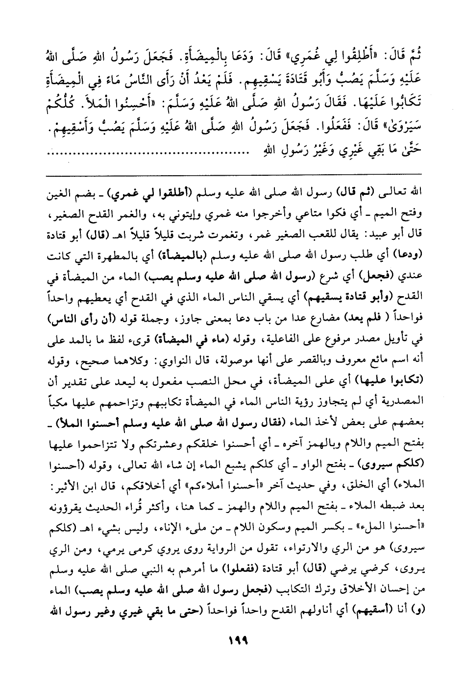 ثُمَّ قَال: "أَطْلِقُوا لِي غُمَرِي" قَال: وَدَعَا بِالْمِيضَأَةِ. فَجَعَلَ رَسُولُ اللهِ - صَلَّى اللهُ عَلَيهِ وَسَلَّمَ - يَصُبُّ وَأَبُو قَتَادَةَ يَسْقِيهِم. فَلَمْ يَعْدُ أَنْ رَأَى النَّاسُ مَاءً فِي الْمِيضَأَةِ تَكَابُّوا عَلَيهَا. فَقَال رَسُولُ اللهِ - صَلَّى اللهُ عَلَيهِ وَسَلَّمَ: "أَحْسِنُوا الْمَلأَ. كُلُّكُمْ سَيَرْوَى" قَال: فَفَعَلُوا. فَجَعَلَ رَسُولُ اللهِ - صَلَّى اللهُ عَلَيهِ وَسَلَّمَ - يَصُبُّ وَأَسْقِيهِمْ. حَتَّى مَا بَقِي غَيرِي وَغَيرُ رَسُولِ اللهِ