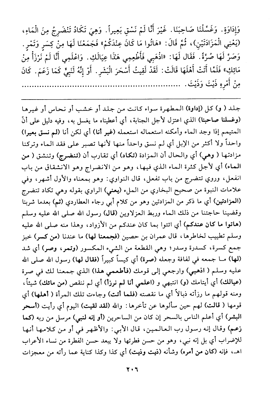 وَإِدَاوَةٍ. وَغَسَّلْنَا صَاحِبَنَا. غَيرَ أَنَّا لَمْ نَسْقِ بَعِيرًا. وَهِيَ تَكَادُ تَنْضَرِجُ مِنَ الْمَاءِ، (يَعْنِي الْمَزَادَتَينِ)، ثُمَّ قَال: "هَاتُوا مَا كَانَ عِنْدَكُمْ" فَجَمَعْنَا لَهَا مِنْ كِسَرٍ وَتَمْرٍ. وَصَرَّ لَهَا صُرَّةً. فَقَال لَهَا: "اذْهَبِي فَأَطْعِمِي هَذَا عِيَالكِ. وَاعْلَمِي أَنَّا لَمْ نَرْزَأْ مِنْ مَائِكِ" فَلَمَّا أَتَتْ أَهْلَهَا قَالتْ: لَقَدْ لَقِيتُ أَسْحَرَ الْبَشَرِ. أَوْ إِنَّهُ لَنَبِيٌّ كَمَا زَعَمَ. كَانَ مِنْ أَمْرِهِ ذَيتَ وَذَيتَ