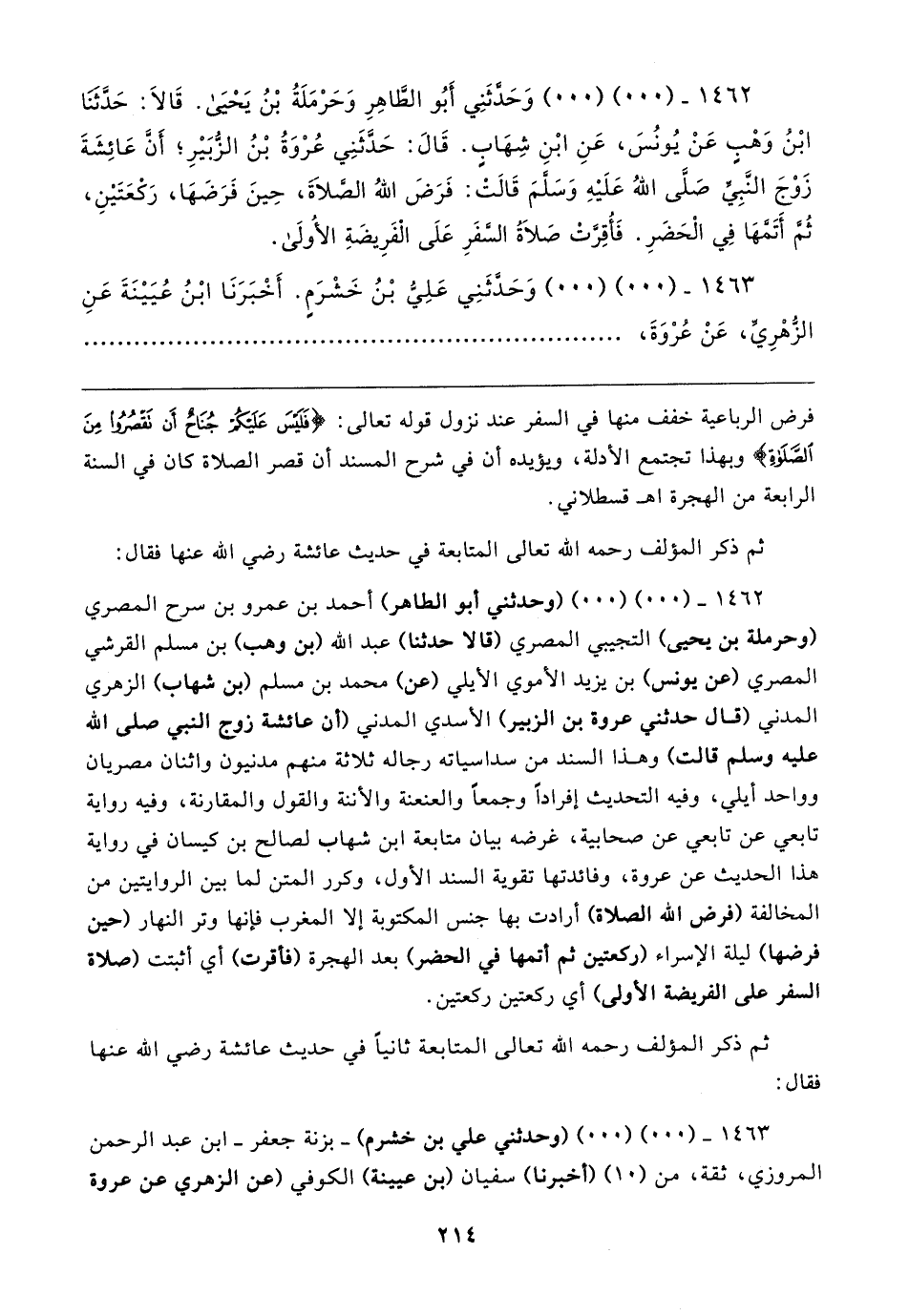 ١٤٦٢ - (٠٠) (٠٠) وَحَدثَنِي أَبُو الطَّاهِرِ وَحَرْمَلَةُ بْنُ يَحْيى. قَالا: حَدَّثَنَا ابْنُ وَهْبٍ عَنْ يُونُسَ، عَنِ ابْنِ شِهَابٍ. قَال: حَدثَنِي عُرْوَةُ بْنُ الزبَيرِ؛ أَنَّ عَائِشَةَ. زَوْجَ النَّبِيِّ صَلى اللهُ عَلَيهِ وَسَلمَ قَالتْ: فَرَضَ اللهُ الصلاةَ، حِينَ فَرَضَهَا، رَكْعَتَينِ، ثُم أَتَمَّهَا فِي الْحَضَرِ. فَأُقِرَّتْ صَلاةُ السفَرِ عَلَى الْفَرِيضَةِ الأُولَى.