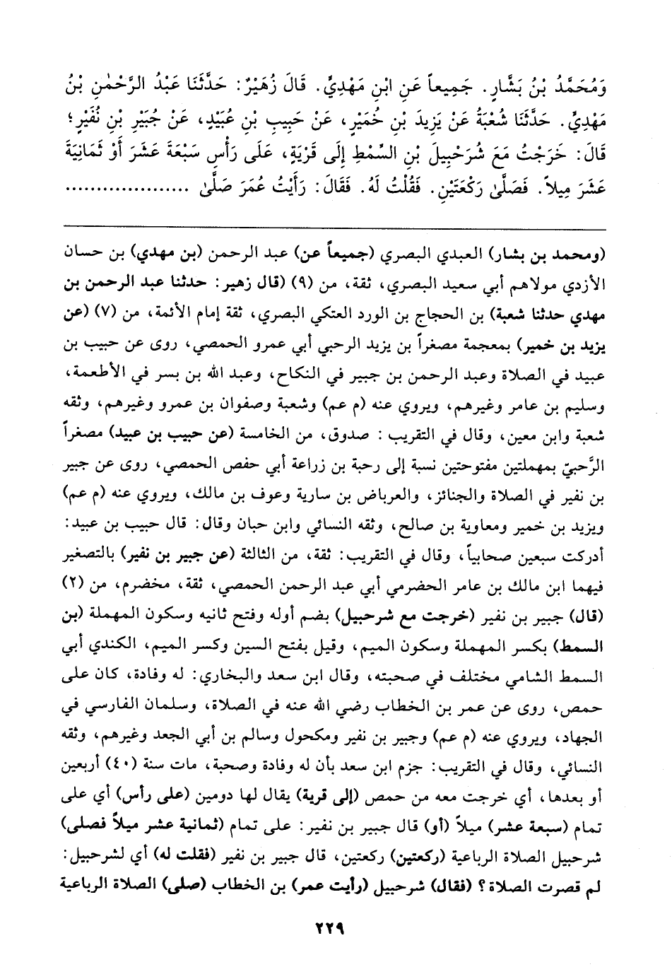 وَمُحَمدُ بْنُ بَشارٍ. جَمِيعًا عَنِ ابْنِ مَهْدِي. قَال زُهَير: حَدَّثَنَا عَبْدُ الرحْمنِ بْنُ مَهْدِي. حَدَّثَنَا شُعْبَةُ عَنْ يَزِيدَ بْنِ خُمَيرٍ، عَنْ حَبِيبِ بْنِ عُبَيدٍ، عَن جُبَيرِ بْنِ نُفَيرٍ؛ قَال: خَرَجْتُ مَعَ شُرَحْبِيلَ بْنِ السِّمْطِ إِلَى قَرْيَةٍ، عَلَى رَأْسِ سَبْعَةَ عَشَرَ أَوْ ثَمَانِيَةَ عَشَرَ مِيلا. فَصَلَّى رَكْعَتَينِ. فَقُلْتُ لَهُ. فَقَال: رَأَيتُ عُمَرَ صَلَّى