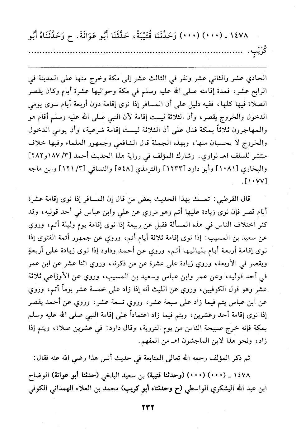 الحادي عشر والثاني عشر ونفر في الثالث عشر إلى مكة وخرج منها على المدينة في الرابع عشر، فمدة إقامته صلى الله عليه وسلم في مكة وحواليها عشرة أيام وكان يقصر الصلاة فيها كلها، ففيه دليل على أن المسافر إذا نوى إقامة دون أربعة أيام سوى يومي الدخول والخروج يقصر، وأن الثلاثة ليست إقامة لأن النبي صلى الله عليه وسلم أقام هو والمهاجرون ثلاثًا بمكة فدل على أن الثلاثة ليست إقامة شرعية، وأن يومي الدخول والخروج لا يحسبان منها، وبهذه الجملة قال الشافعي وجمهور العلماء وفيها خلاف منتشر للسلف اهـ نواوي. وشارك المؤلف في رواية هذا الحديث أحمد [٣/ ١٨٧ و ٢٨٢] والبخاري [١٠٨١] وأبو داود [١٢٣٣] والترمذي [٥٤٨] والنسائي [٣/ ١٢١] وابن ماجه [١٠٧٧].