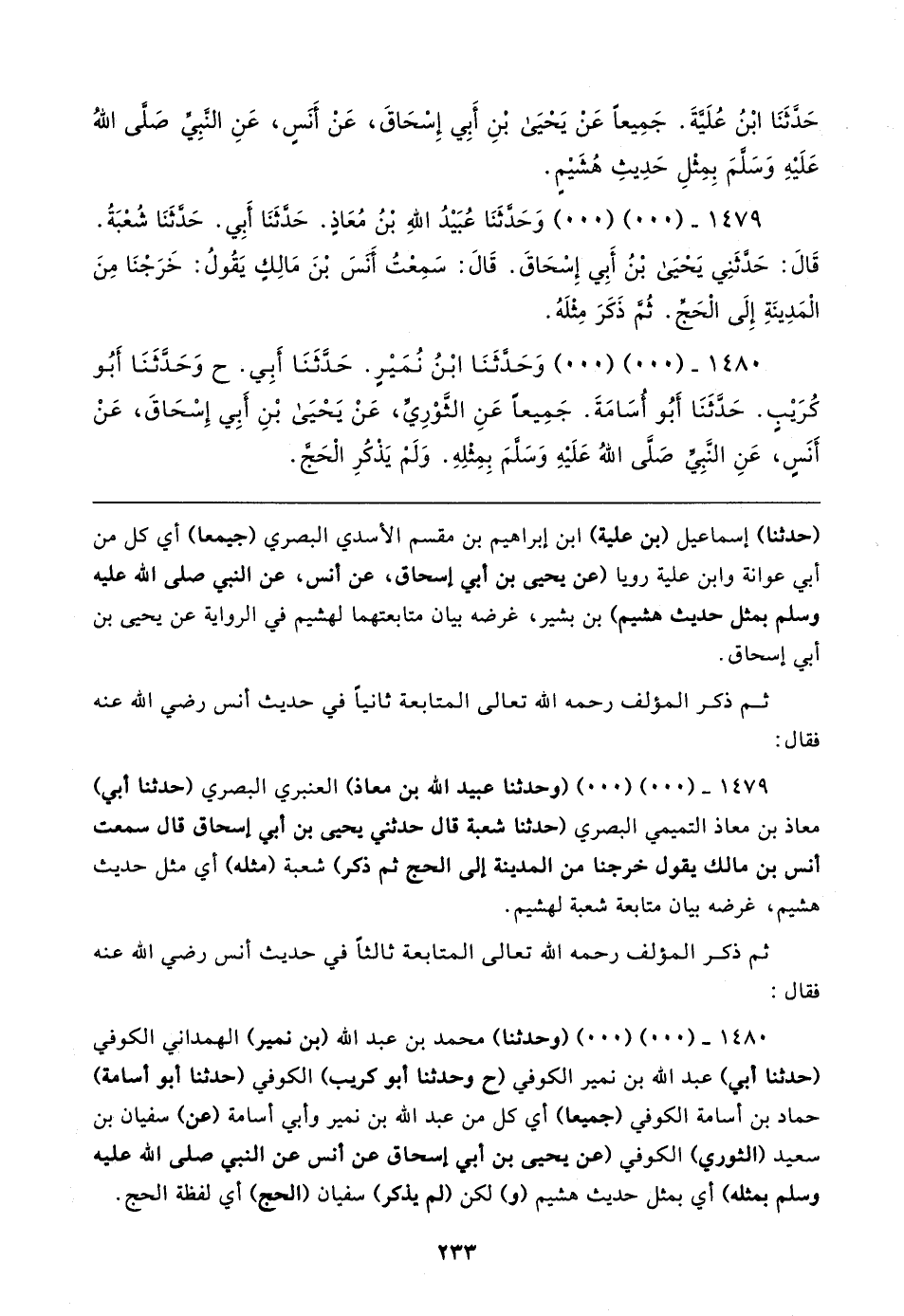 ١٤٨٠ - (٠٠) (٠٠) (وحدثنا) محمد بن عبد الله (بن نمير) الهمداني الكوفي (حدثنا أبي) عبد الله بن نمير الكوفي (ح وحدثنا أبو كريب) الكوفي (حدثنا أبو أسامة) حماد بن أسامة الكوفي (جميعا) أي كل من عبد الله بن نمير وأبي أسامة (عن) سفيان بن سعيد (الثوري) الكوفي (عن يحيى بن أبي إسحاق عن أنس عن النبي صلى الله عليه وسلم بمثله) أي بمثل حديث هشيم (و) لكن (لم يذكر) سفيان (الحج) أي لفظة الحج.