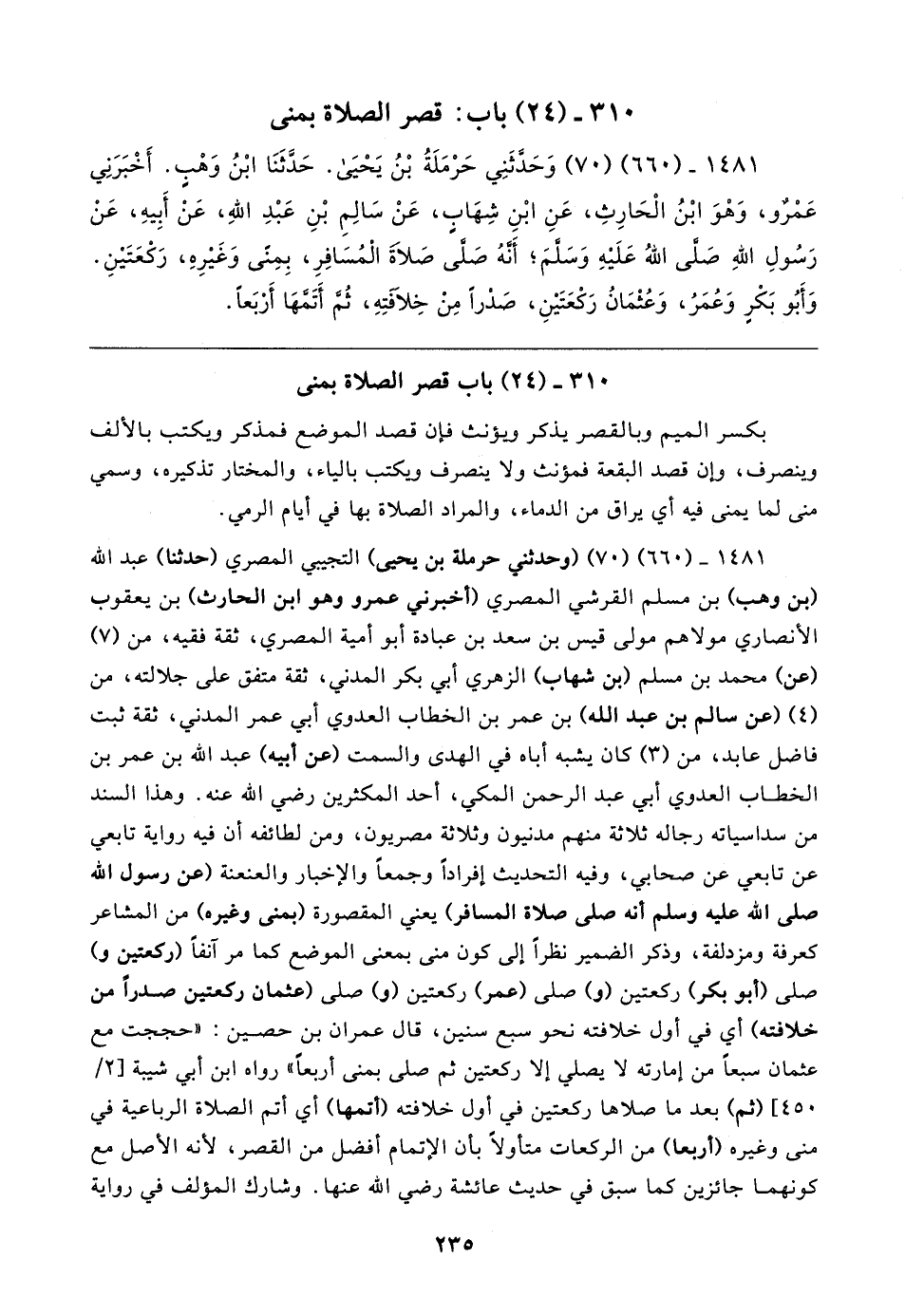 ١٤٨١ - (٦٦٠) (٧٠) (وحدثني حرملة بن يحيى) التجيبي المصري (حدثنا) عبد الله (بن وهب) بن مسلم القرشي المصري (أخبرني عمرو وهو ابن الحارث) بن يعقوب الأنصاري مولاهم مولى قيس بن سعد بن عبادة أبو أمية المصري، ثقة فقيه، من (٧) (عن) محمد بن مسلم (بن شهاب) الزهري أبي بكر المدني، ثقة متفق على جلالته، من (٤) (عن سالم بن عبد الله) بن عمر بن الخطاب العدوي أبي عمر المدني، ثقة ثبت فاضل عابد، من (٣) كان يشبه أباه في الهدى والسمت (عن أبيه) عبد الله بن عمر بن الخطاب العدوي أبي عبد الرحمن المكي، أحد المكثرين رضي الله عنه. وهذا السند من سداسياته رجاله ثلاثة منهم مدنيون وثلاثة مصريون، ومن لطائفه أن فيه رواية تابعي عن تابعي عن صحابي، وفيه التحديث إفرادًا وجمعًا والإخبار والعنعنة (عن رسول الله صلى الله عليه وسلم أنه صلى صلاة المسافر) يعني المقصورة (بمنى وغيره) من المشاعر كعرفة ومزدلفة، وذكر الضمير نظرًا إلى كون منى بمعنى الموضع كما مر آنفًا (ركعتين و) صلى (أبو بكر) ركعتين (و) صلى (عمر) ركعتين (و) صلى (عثمان ركعتين صدرًا من خلافته) أي في أول خلافته نحو سبع سنين، قال عمران بن حصين: "حججت مع عثمان سبعًا من إمارته لا يصلي إلا ركعتين ثم صلى بمنى أربعًا" رواه ابن أبي شيبة [٢/ ٤٥٠] (ثم) بعد ما صلاها ركعتين في أول خلافته (أتمها) أي أتم الصلاة الرباعية في منى وغيره (أربعا) من الركعات متأولًا بأن الإتمام أفضل من القصر، لأنه الأصل مع كونهما جائزين كما سبق في حديث عائشة رضي الله عنها. وشارك المؤلف في رواية