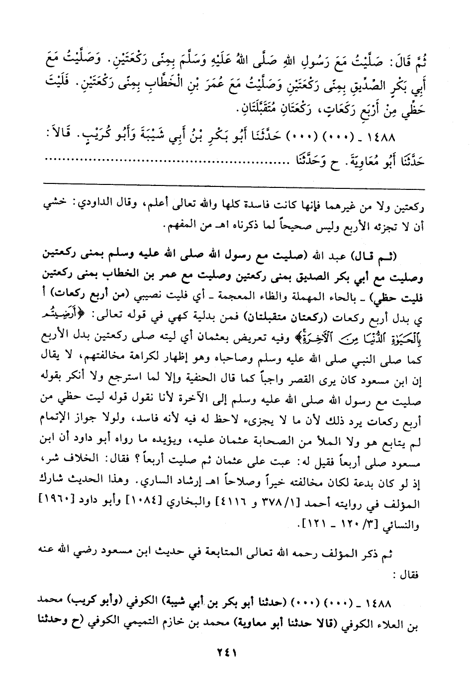 ثُم قَال: صَليتُ مَعَ رَسُولِ اللهِ صلى اللهُ عَلَيهِ وَسَلمَ بِمِنى رَكعَتَينِ. وَصَليتُ مَعَ أَبِي بَكْر الصديقِ بِمِنى رَكْعَتَينِ وَصَليتُ مَعَ عُمَرَ بنِ الْخَطابِ بِمِنى رَكْعَتَينِ. فَلَيتَ حَظي مِنْ أَرْبَعِ رَكَعَاتٍ، رَكْعَتَانِ مُتَقَبلَتَانِ.