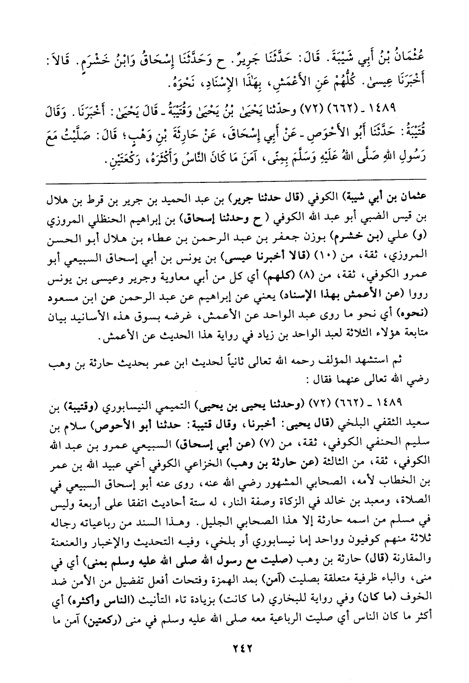 ١٤٨٩ - (٦٦٢) (٧٢) (وحدثنا يحيى بن يحيى) التميمي النيسابوري (وقتيبة) بن سعيد الثقفي البلخي (قال يحيى: أخبرنا، وقال قتيبة: حدثنا أبو الأحوص) سلام بن سليم الحنفي الكوفي، ثقة، من (٧) (عن أبي إسحاق) السبيعي عمرو بن عبد الله الكوفي، ثقة، من الثالثة (عن حارثة بن وهب) الخزاعي الكوفي أخي عبيد الله بن عمر بن الخطاب لأمه، الصحابي المشهور رضي الله عنه، روى عنه أبو إسحاق السبيعي في الصلاة، ومعبد بن خالد في الزكاة وصفة النار، له ستة أحاديث اتفقا على أربعة وليس في مسلم من اسمه حارثة إلا هذا الصحابي الجليل. وهذا السند من رباعياته رجاله ثلاثة منهم كوفيون وواحد إما نيسابوري أو بلخي، وفيه التحديث والإخبار والعنعنة والمقارنة (قال) حارثة بن وهب (صليت مع رسول الله صلى الله عليه وسلم بمنى) أي في منى، والباء ظرفية متعلقة بصليت (آمن) بمد الهمزة وفتحات أفعل تفضيل من الأمن ضد الخوف (ما كان) وفي رواية للبخاري (ما كانت) بزيادة تاء التأنيث (الناس وأكثره) أي أكثر ما كان الناس أي صليت الرباعية معه صلى الله عليه وسلم في منى (ركعتين) آمن ما
