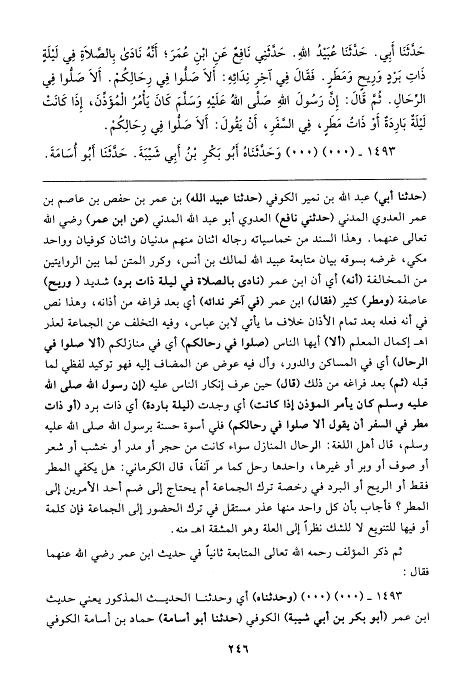 حَدَّثَنَا أَبِي. حَدَّثَنَا عُبَيدُ اللهِ. حَدثَنِي نَافِع عَنِ ابْنِ عُمَرَ؛ أَنهُ نَادَى بِالصلاةِ فِي لَيلَةٍ ذَاتِ بَرْدٍ وَرِيحٍ وَمَطَرٍ. فَقَال فِي آخِرِ نِدَائِهِ: أَلا صَلوا فِي رِحَالِكُمْ. أَلا صَلوا فِي الرحَالِ. ثُم قَال: إِن رَسُول اللهِ صلى اللهُ عَلَيهِ وَسَلمَ كَانَ يَأمُرُ الْمُؤَذنَ، إِذَا كَانَت لَيلَة بَارِدَة أَوْ ذَاتُ مَطَر، فِي السفَرِ، أَنْ يَقُولَ: ألا صَلوا فِي رِحَالِكُمْ.