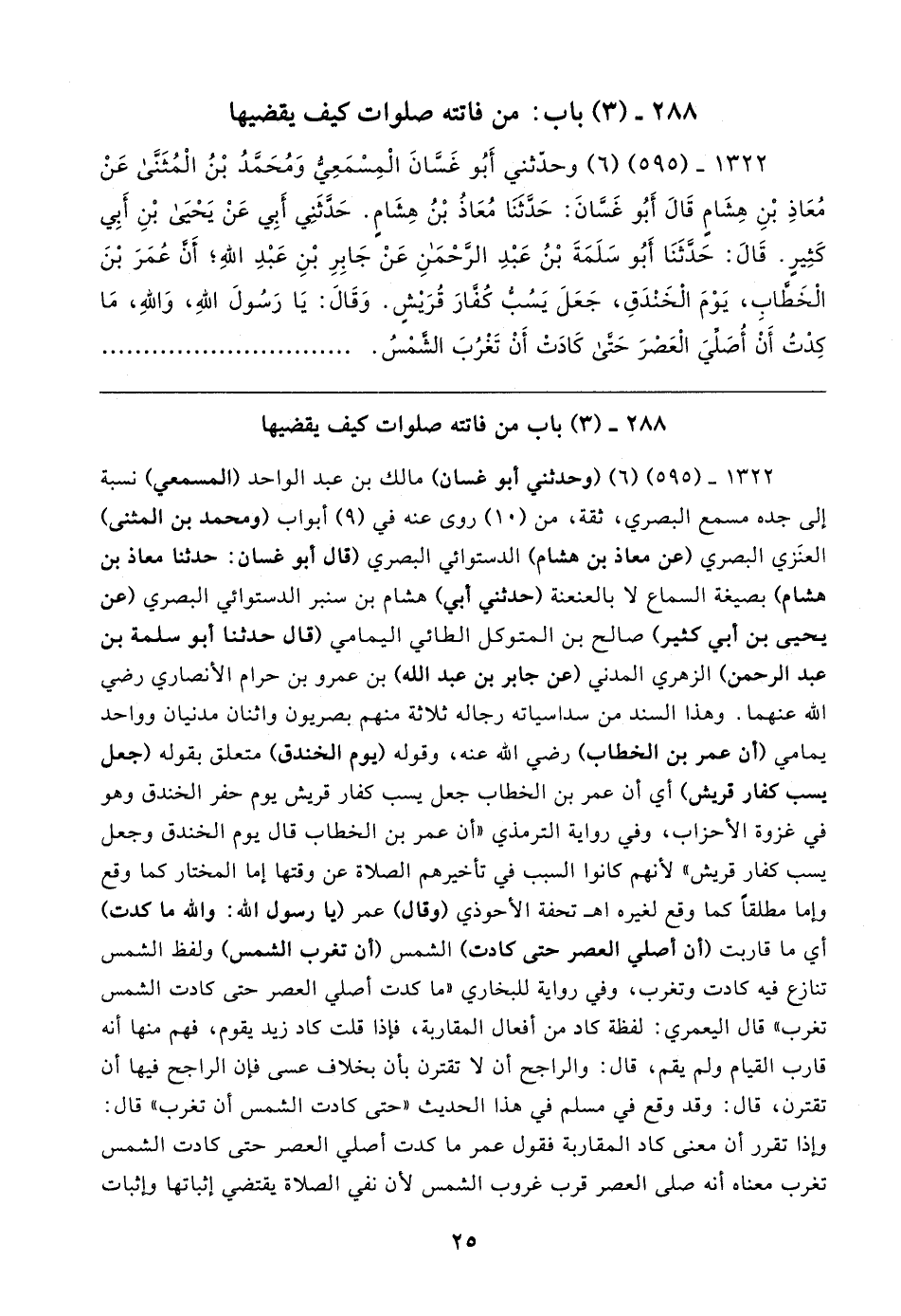 ١٣٢٢ - (٥٩٥) (٦) (وحدثني أبو غسان) مالك بن عبد الواحد (المسمعي) نسبة إلى جده مسمع البصري، ثقة، من (١٠) روى عنه في (٩) أبواب (ومحمد بن المثنى) العنَزي البصري (عن معاذ بن هشام) الدستوائي البصري (قال أبو غسان: حدثنا معاذ بن هشام) بصيغة السماع لا بالعنعنة (حدثني أبي) هشام بن سنبر الدستوائي البصري (عن يحيى بن أبي كثير) صالح بن المتوكل الطائي اليمامي (قال حدثنا أبو سلمة بن عبد الرحمن) الزهري المدني (عن جابر بن عبد الله) بن عمرو بن حرام الأنصاري رضي الله عنهما. وهذا السند من سداسياته رجاله ثلاثة منهم بصريون واثنان مدنيان وواحد يمامي (أن عمر بن الخطاب) رضي الله عنه، وقوله (يوم الخندق) متعلق بقوله (جعل يسب كفار قريش) أي أن عمر بن الخطاب جعل يسب كفار قريش يوم حفر الخندق وهو في غزوة الأحزاب، وفي رواية الترمذي "أن عمر بن الخطاب قال يوم الخندق وجعل يسب كفار قريش" لأنهم كانوا السبب في تأخيرهم الصلاة عن وقتها إما المختار كما وقع وإما مطلقًا كما وقع لغيره اهـ تحفة الأحوذي (وقال) عمر (يا رسول الله: والله ما كدت) أي ما قاربت (أن أصلي العصر حتى كادت) الشمس (أن تغرب الشمس) ولفظ الشمس تنازع فيه كادت وتغرب، وفي رواية للبخاري "ما كدت أصلي العصر حتى كادت الشمس تغرب" قال اليعمري: لفظة كاد من أفعال المقاربة، فإذا قلت كاد زيد يقوم، فهم منها أنه قارب القيام ولم يقم، قال: والراجح أن لا تقترن بأن بخلاف عسى فإن الراجح فيها أن تقترن، قال: وقد وقع في مسلم في هذا الحديث "حتى كادت الشمس أن تغرب" قال: وإذا تقرر أن معنى كاد المقاربة فقول عمر ما كدت أصلي العصر حتى كادت الشمس تغرب معناه أنه صلى العصر قرب غروب الشمس لأن نفي الصلاة يقتضي إثباتها وإثبات