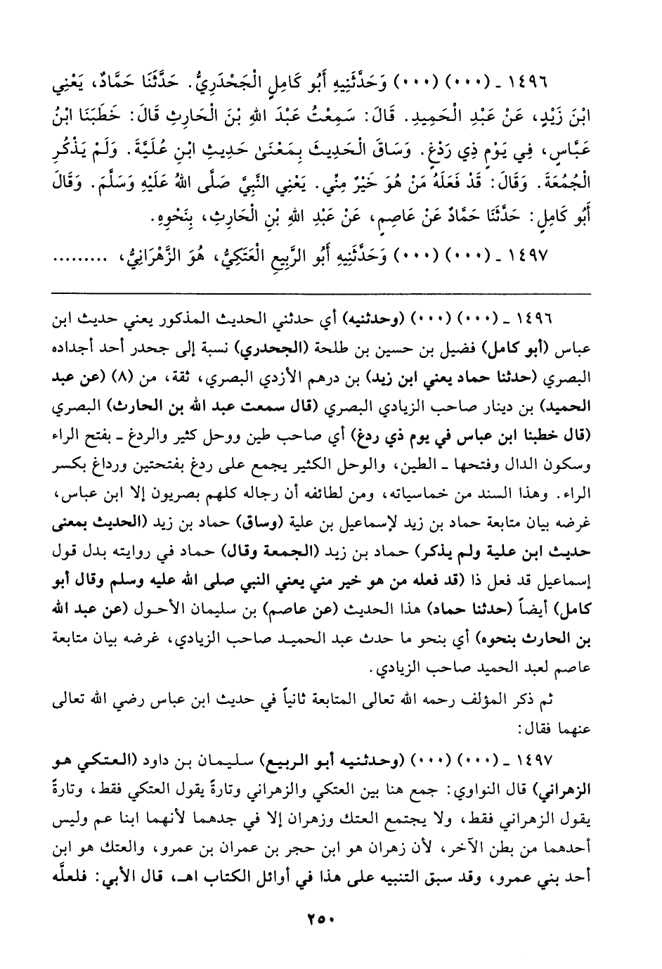 ١٤٩٦ - (٠٠) (٠٠) (وحدثنيه) أي حدثني الحديث المذكور يعني حديث ابن عباس (أبو كامل) فضيل بن حسين بن طلحة (الجحدري) نسبة إلى جحدر أحد أجداده البصري (حدثنا حماد يعني ابن زيد) بن درهم الأزدي البصري، ثقة، من (٨) (عن عبد الحميد) بن دينار صاحب الزيادي البصري (قال سمعت عبد الله بن الحارث) البصري (قال خطبنا ابن عباس في يوم ذي ردغ) أي صاحب طين ووحل كثير والردغ -بفتح الراء وسكون الدال وفتحها- الطين، والوحل الكثير يجمع على ردغ بفتحتين ورداغ بكسر الراء. وهذا السند من خماسياته، ومن لطائفه أن رجاله كلهم بصريون إلا ابن عباس، غرضه بيان متابعة حماد بن زيد لإسماعيل بن علية (وساق) حماد بن زيد (الحديث بمعنى حديث ابن علية ولم يذكر) حماد بن زيد (الجمعة وقال) حماد في روايته بدل قول إسماعيل قد فعل ذا (قد فعله من هو خير مني يعني النبي صلى الله عليه وسلم وقال أبو كامل) أيضًا (حدثنا حماد) هذا الحديث (عن عاصم) بن سليمان الأحول (عن عبد الله بن الحارث بنحوه) أي بنحو ما حدث عبد الحميد صاحب الزيادي، غرضه بيان متابعة عاصم لعبد الحميد صاحب الزيادي.