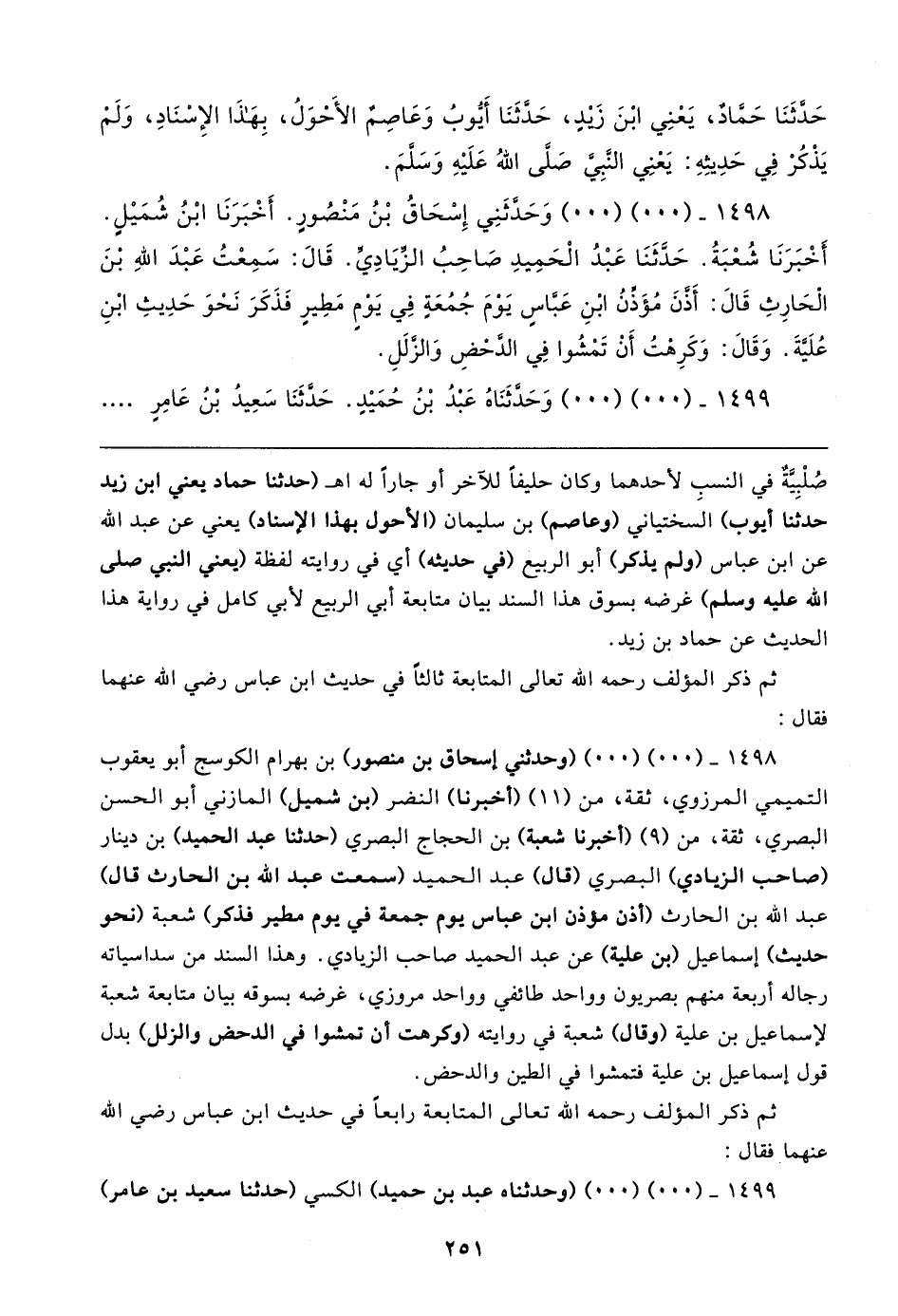 ١٤٩٨ - (٠٠) (٠٠) وحدثني إسحاق بن منصور) بن بهرام الكوسج أبو يعقوب التميمي المرزوي، ثقة، من (١١) (أخبرنا) النضر (بن شميل) المازني أبو الحسن البصري، ثقة، من (٩) (أخبرنا شعبة) بن الحجاج البصري (حدثنا عبد الحميد) بن دينار (صاحب الزيادي) البصري (قال) عبد الحميد (سمعت عبد الله بن الحارث قال) عبد الله بن الحارث (أذن مؤذن ابن عباس يوم جمعة في يوم مطير فذكر) شعبة (نحو حديث) إسماعيل (بن علية) عن عبد الحميد صاحب الزيادي. وهذا السند من سداسياته رجاله أربعة منهم بصريون وواحد طائفي وواحد مروزي، غرضه بسوقه بيان متابعة شعبة لإسماعيل بن علية (وقال) شعبة في روايته (وكرهت أن تمشوا في الدحض والزلل) بدل قول إسماعيل بن علية فتمشوا في الطين والدحض.