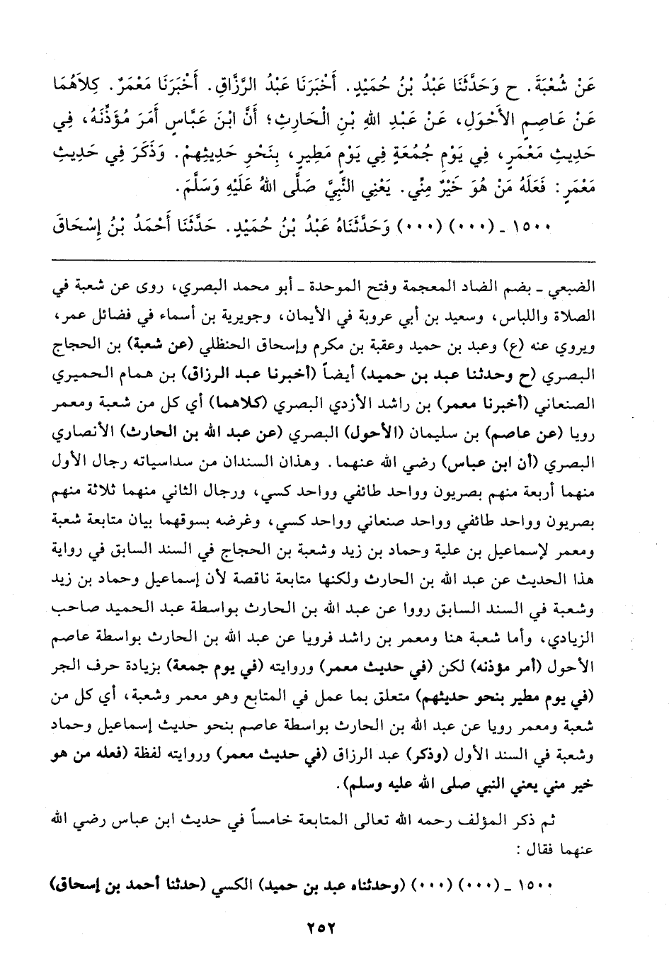 الضبعي -بضم الضاد المعجمة وفتح الموحدة- أبو محمد البصري، روى عن شعبة في الصلاة واللباس، وسعيد بن أبي عروبة في الأيمان، وجويرية بن أسماء في فضائل عمر، ويروي عنه (ع) وعبد بن حميد وعقبة بن مكرم وإسحاق الحنظلي (عن شعبة) بن الحجاج البصري (ح وحدثنا عبد بن حميد) أيضًا (أخبرنا عبد الرزاق) بن همام الحميري الصنعاني (أخبرنا معمر) بن راشد الأزدي البصري كلاهما) أي كل من شعبة ومعمر رويا (عن عاصم) بن سليمان (الأحول) البصري (عن عبد الله بن الحارث) الأنصاري البصري (أن ابن عباس) رضي الله عنهما. وهذان السندان من سداسياته رجال الأول منهما أربعة منهم بصريون وواحد طائفي وواحد كسي، ورجال الثاني منهما ثلاثة منهم بصريون وواحد طائفي وواحد صنعاني وواحد كسي، وغرضه بسوقهما بيان متابعة شعبة ومعمر لإسماعيل بن علية وحماد بن زيد وشعبة بن الحجاج في السند السابق في رواية هذا الحديث عن عبد الله بن الحارث ولكنها متابعة ناقصة لأن إسماعيل وحماد بن زيد وشعبة في السند السابق رووا عن عبد الله بن الحارث بواسطة عبد الحميد صاحب الزيادي، وأما شعبة هنا ومعمر بن راشد فرويا عن عبد الله بن الحارث بواسطة عاصم الأحول (أمر موذنه) لكن (في حديث معمر) وروايته (في يوم جمعة) بزيادة حرف الجر (في يوم مطير بنحو حديثهم) متعلق بما عمل في المتابع وهو معمر وشعبة، أي كل من شعبة ومعمر رويا عن عبد الله بن الحارث بواسطة عاصم بنحو حديث إسماعيل وحماد وشعبة في السند الأول (وذكر) عبد الرزاق (في حديث معمر) وروايته لفظة (فعله من هو خير مني يعني النبي صلى الله عليه وسلم).