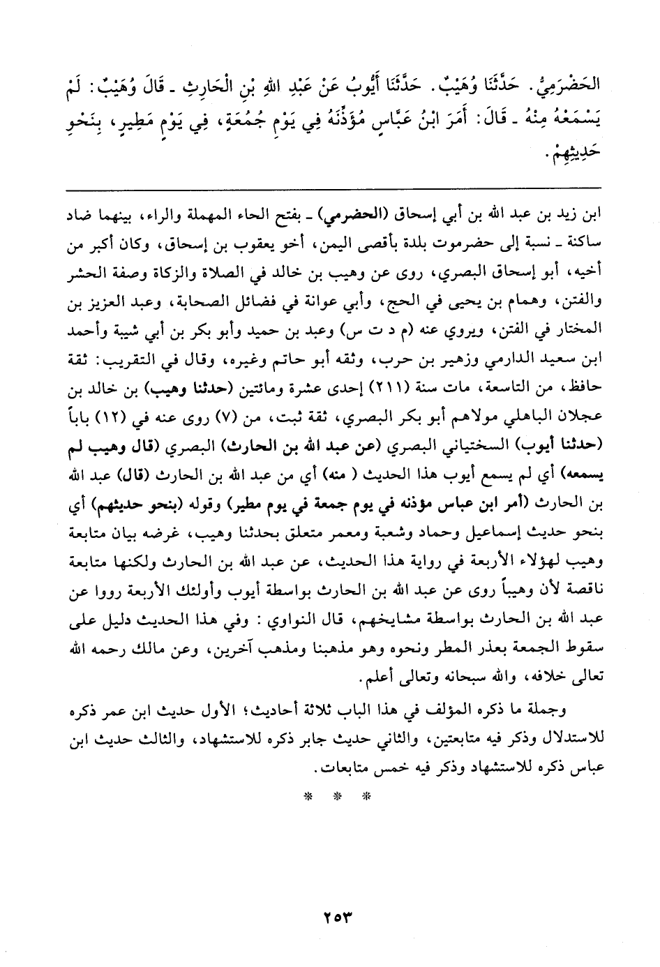 الحَضْرَميُّ. حَدَّثَنَا وُهَيبٌ. حَدَّثَنَا أيوبُ عَنْ عَبْدِ اللهِ بْنِ الْحَارِثِ -قَال وُهَيبٌ: لَمْ يَسْمَعْهُ مِنْهُ- قَال: أَمَرَ ابْنُ عَباسٍ مُؤَذنَهُ فِي يَوْمِ جُمُعَةِ، فِي يَوْمٍ مَطِيرٍ، بِنَحْو حَدِيثِهِمْ