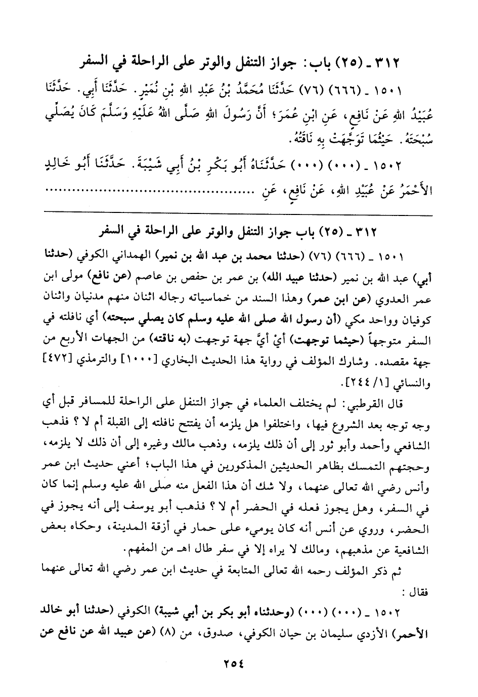 ١ ١٥٠ - (٦٦٦) (٧٦) (حدثنا محمد بن عبد الله بن نمير) الهمداني الكوفي (حدثنا أبي) عبد الله بن نمير (حدثنا عبيد الله) بن عمر بن حفص بن عاصم (عن نافع) مولى ابن عمر العدوي (عن ابن عمر) وهذا السند من خماسياته رجاله اثنان منهم مدنيان واثنان كوفيان وواحد مكي (أن رسول الله صلى الله عليه وسلم كان يصلي سبحته) أي نافلته في السفر متوجهًا (حيثما توجهت) أي أي جهة توجهت (به ناقته) من الجهات الأربع من جهة مقصده. وشارك المؤلف في رواية هذا الحديث البخاري [١٠٠٠] والترمذي [٤٧٢] والنسائي [١/ ٢٤٤].