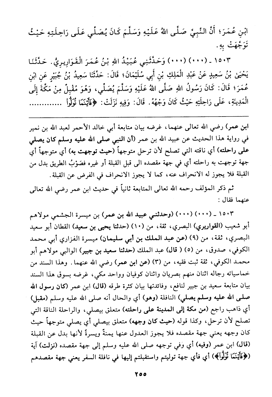 ١٥٠٣ - (٠٠) (٠٠) (وحدثني عبيد الله بن عمر) بن ميسرة الجشمي مولاهم أبو شعيب (القواريري) البصري، ثقة، من (١٠) (حدثنا يحيى بن سعيد) القطان أبو سعيد البصري، ثقة، من (٩) (عن عبد الملك بن أبي سليمان) ميسرة الفزاري أبي محمد الكوفي، صدوق، من (٥) (قال) عبد الملك (حدثنا سعيد بن جبير) الوالبي مولاهم أبو محمد الكوفي، ثقة ثبت فقيه، من (٣) (عن ابن عمر) رضي الله عنهما. وهذا السند من خماسياته رجاله اثنان منهم بصريان واثنان كوفيان وواحد مكي، غرضه بسوق هذا السند بيان متابعة سعيد بن جبير لنافع، وفائدتها بيان كثرة طرقه (قال) ابن عمر (كان رسول الله صلى الله عليه وسلم يصلي) النافلة (وهو) أي والحال أنه صلى الله عليه وسلم (مقبل) أي ذاهب راجع (من مكة إلى المدينة على راحلته) متعلق بيصلي، والراحلة الناقة التي تصلح لأن ترحل، وكذا قوله (حيث كان وجهه) متعلق بيصلي أي يصلي متوجهًا حيث كان وجهه يعني جهة مقصده فلا يجوز العدول عنها يمنةً ويسرةً لأنها بدل عن القبلة (قال) ابن عمر (وفيه) أي وَفي توجهه صلى الله عليه وسلم إلى جهة مقصده (نزلت) آية ({فَأَينَمَا تُوَلُّوا}) أي فأي جهة توليتم واستقبلتم إليها في نافلة السفر يعني جهة مقصدهم