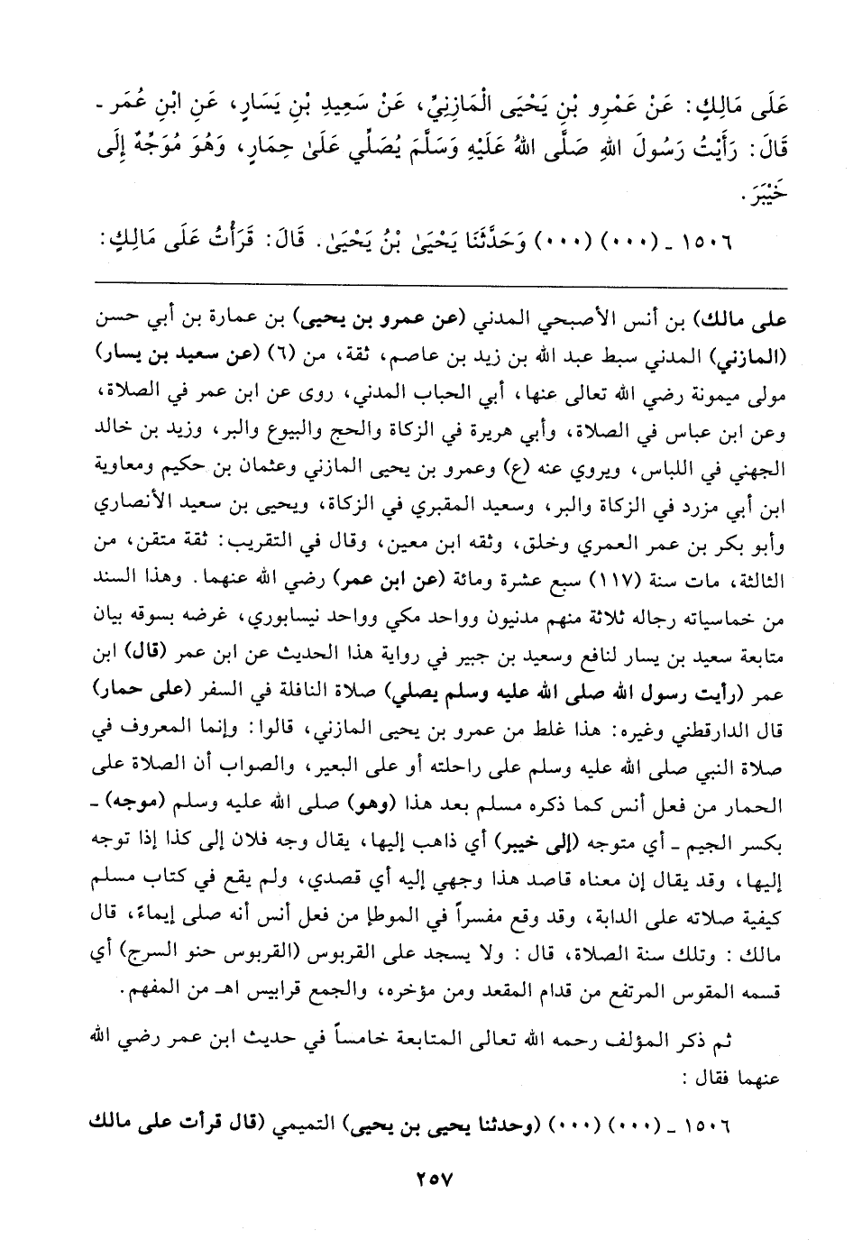 عَلَى مَالِكٍ: عَنْ عَمْرِو بْنِ يَحْيَى الْمَازِني، عَنْ سَعِيدِ بْنِ يَسَارٍ، عَنِ ابْنِ عُمَر - قَال: رَأَيتُ رَسُولَ اللهِ صلى اللهُ عَلَيهِ وَسَلمَ يُصَلي عَلَي حِمَارٍ، وَهُوَ مُوَجِّهٌ إِلَى خَيبَرَ.
