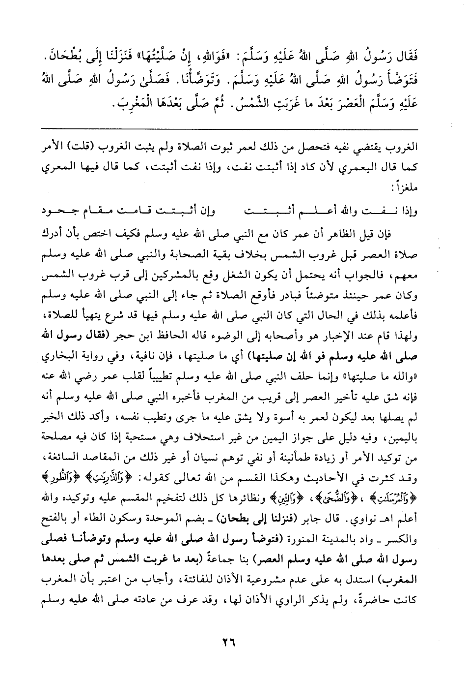 فَقَال رَسُولُ اللهِ - صلى الله عليه وسلم -: "فَوَاللهِ، إِنْ صَلَّيتُهَا" فَنَزَلْنَا إِلَى بُطحَانَ. فَتَوَضَّأَ رَسُولُ اللهِ - صلى الله عليه وسلم -. وَتَوَضأنَا. فَصَلَّى رَسُولُ اللهِ - صلى الله عليه وسلم - الْعَصْرَ بَعْدَ ما غَرَبَتِ الشمْسُ. ثُم صَلَّى بَعْدَهَا الْمَغْرِبَ