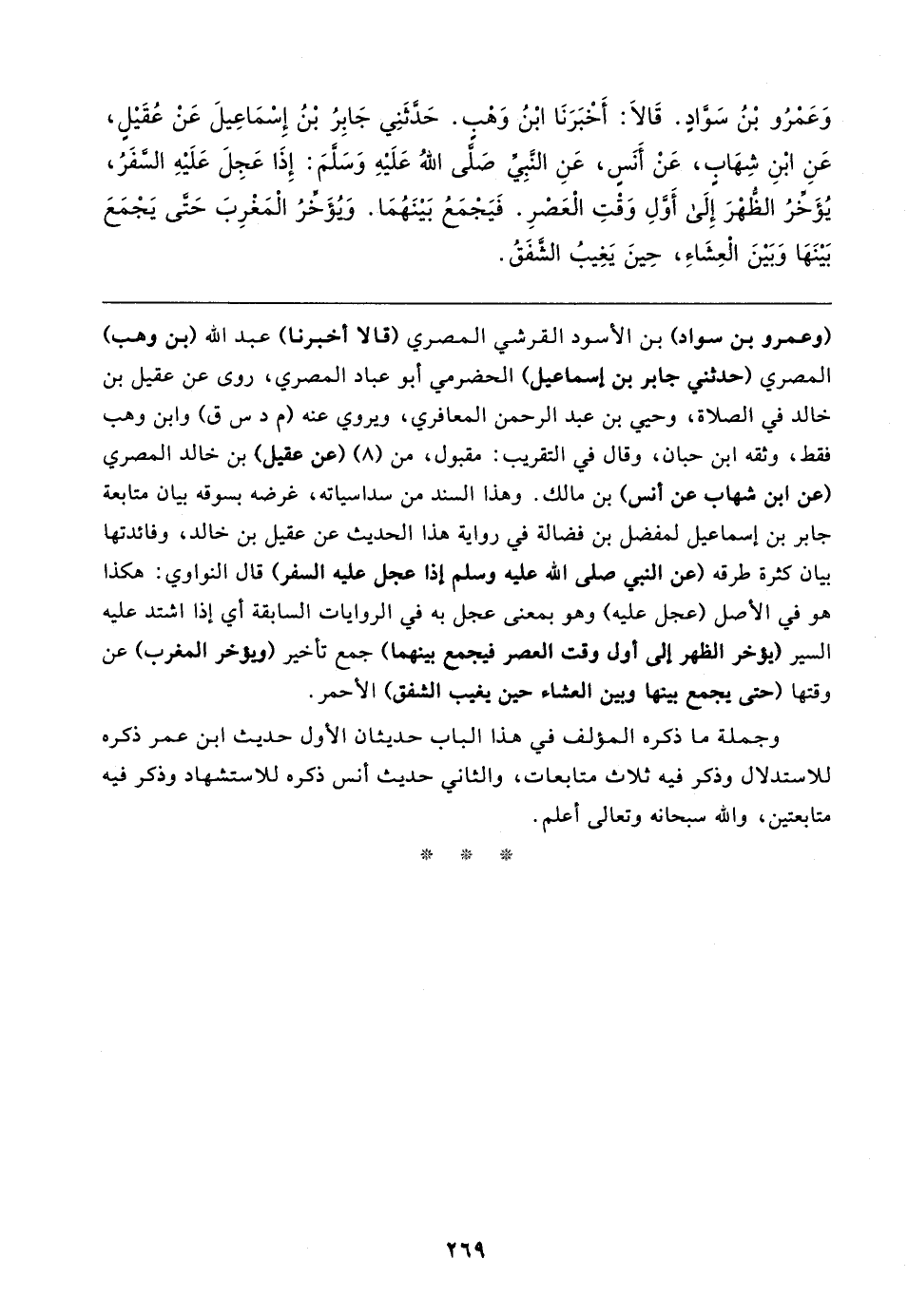 وَعمرُو بْنُ سَوَّادٍ. قَالا: أَخْبَرَنَا ابْنُ وَهب. حَدَّثَنِي جَابِرُ بْنُ إِسْمَاعِيلَ عَنْ عُقَيلٍ، عَنِ ابْنِ شِهابٍ، عَنْ أَنَسٍ، عَنِ النَّبِي صَلَّى اللهُ عَلَيهِ وَسَلمَ: إِذَا عَجِلَ عَلَيهِ السفَرُ، يُؤَخِّرُ الظُّهْرَ إِلَى أَوَّلِ وَقْتِ الْعصرِ. فَيَجْمَعُ بَينَهُمَا. ويؤَخِّرُ الْمَغْرِبَ حَتَّى يَجْمَعَ بَينها وَبَينَ الْعِشَاءِ، حِينَ يَغِيبُ الشفَقُ
