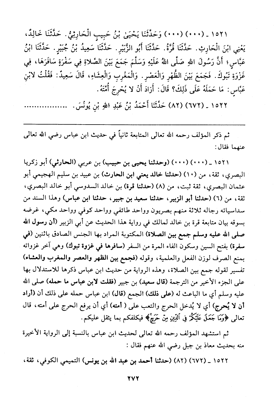 ١٥٢١ - (٠٠) (٠٠) (وحدثنا يحبى بن حبيب) بن عربي (الحارثي) أبو زكريا البصري، ثقة، من (١٠) (حدثنا خالد يعني ابن الحارث) بن عبيد بن سليم الهجيمي أبو عثمان البصري، ثقة ثبت، من (٨) (حدثنا قرة) بن خالد السدوسي أبو خالد البصري، ثقة، من (٦) (حدثنا أبو الزبير، حدثنا سعيد بن جبير، حدثنا ابن عباس) وهذا السند من سداسياته رجاله ثلاثة منهم بصريون وواحد طائفي وواحد كوفي وواحد مكي، غرضه بسوقه بيان متابعة قرة بن خالد لمالك في رواية هذا الحديث عن أبي الزبير (أن رسول الله صلى الله عليه وسلم جمع بين الصلاة) المكتوبة المراد بها الجنس الصادق باثنين (في سفرة) بفتح السين وسكون الفاء المرة من السفر (سافرها في غزوة تبوك) وهي آخر غزواته بمنع الصرف لوزن الفعل والعلمية، وقوله (فجمع بين الظهر والعصر والمغرب والعشاء) تفسير لقوله جمع بين الصلاة، وهذه الرواية عن حديث ابن عباس ذكرها للاستدلال بها على الجزء الأخير من الترجمة (قال سعيد) بن جبير (فقلت لاين عباس ما حمله) صلى الله عليه وسلم أي ما الباعث له (على ذلك) الجمع (قال) ابن عباس حمله على ذلك أن (أراد أن لا يُحرج) أي لا يُدخل الحرج والتعب على (أمته) أي أن يرفع الحرج على أمته، قال تعالى {وَمَا جَعَلَ عَلَيكُمْ فِي الدِّينِ مِنْ حَرَجٍ} فيكلفكم بما يثقل عليكم.