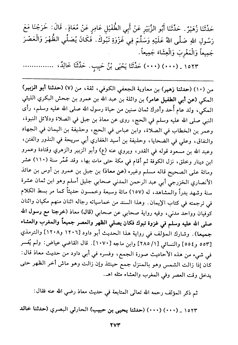 حَدَثَنَا زُهيرَ. حَدَّثَنَا أَبُو الزبَيرِ عَنْ أَبِي الطفَيلِ عَامِرٍ عَنْ مُعَاذٍ. قَال: خَرَجْنَا مَعَ رَسُولِ اللهِ صَلَّى اللهُ عَلَيهِ وَسَلمَ فِي غَزْوَةِ تَبُوكَ. فَكَانَ يُصَلِّي الظُّهْرَ وَالْعَصرَ جَمِيعًا وَالْمَغرِبَ وَالْعِشَاءَ جَمِيعًا.