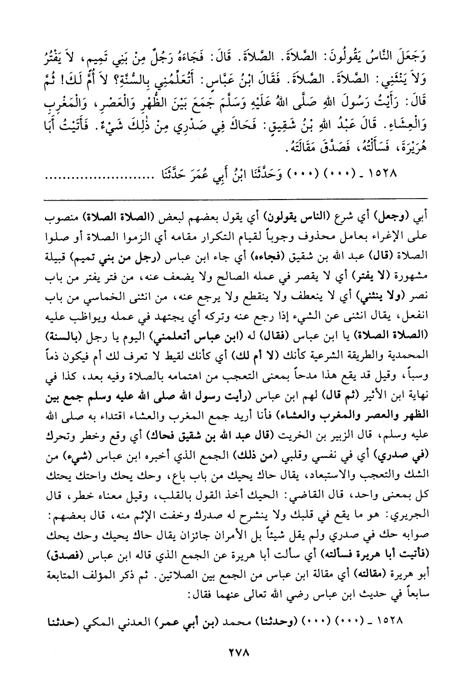 وَجَعَلَ النَّاسُ يَقُولُونَ: الصلاةَ. الصَّلاةَ. قَال: فَجَاءَهُ رَجُلٌ مِنْ بَنِي تَمِيم، لَا يَفْتُرُ وَلَا يَنْثَنِي: الصلاةَ. الصلاةَ. فَقَال ابْنُ عَباسٍ: أَتُعلمُنِي بِالسنةِ؟ لَا أُمَّ لَكَ! ثُمَّ قَال: رَأَيتُ رَسُولَ اللهِ صَلَّى اللهُ عَلَيهِ وَسَلمَ جَمَعَ بَينَ الظُّهْرِ وَالْعَصرِ، وَالْمَغْرِبِ وَالْعِشَاءِ. قَال عَبْدُ اللهِ بْنُ شَقِيقٍ: فَحَاكَ فِي صَدرِي مِنْ ذلِكَ شَيءٌ. فَأَتَيتُ أبَا هُرَيرَةَ، فَسَأَلْتُهُ، فَصدَّقَ مَقَالتَهُ.