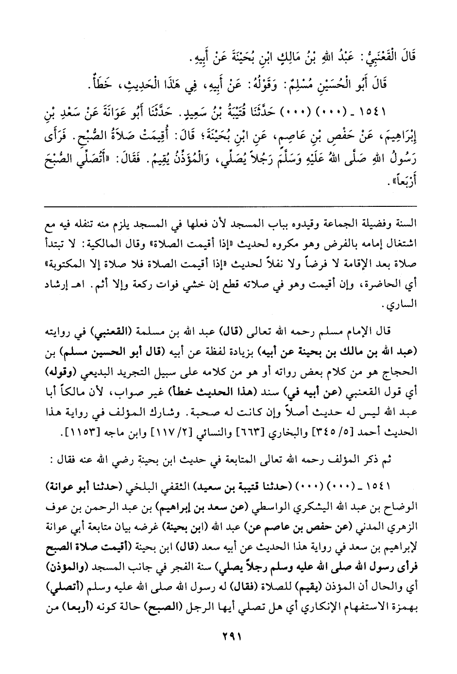 ١٥٤١ - (٠٠) (٠٠) حَدَّثَنَا قُتَيبَةُ بْنُ سَعِيدٍ. حَدَّثَنَا أَبُو عَوَانَةَ عَنْ سَعْدِ بْنِ إِبْرَاهِيمَ، عَنْ حَفْصِ بْنِ عَاصِمٍ، عَنِ ابْنِ بُحَينَةَ؛ قَال: أُقِيمَتْ صَلاةُ الصُبْحِ. فَرَأَى رَسُولُ اللهِ صَلى اللهُ عَلَيهِ وَسَلمَ رَجُلًا يُصَلِّي، وَالْمُؤَذنُ يُقِيمُ. فَقَال: "أَتُصَلِّي الصُّبْحَ أَربَعًا"
