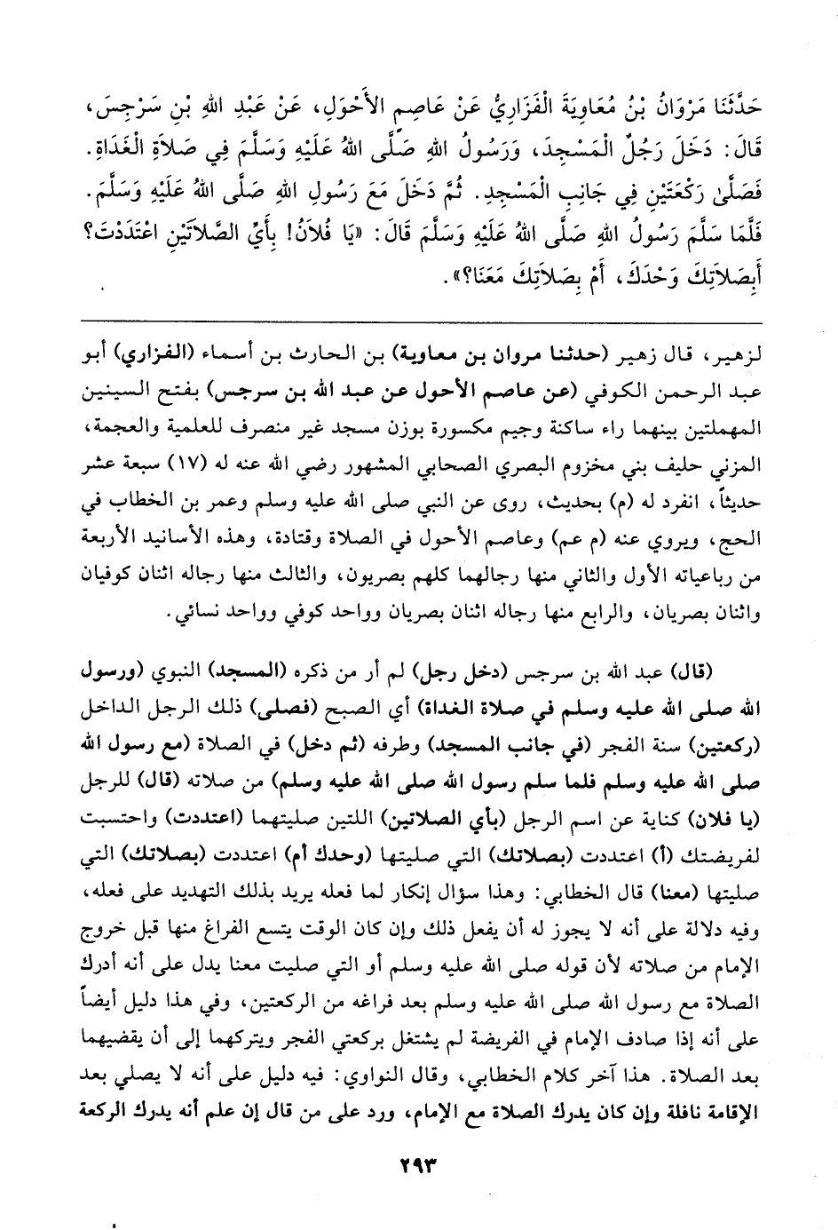 حَدَّثَنَا مَروَانُ بْنُ مُعَاويةَ الْفَزَارِيُّ عَنْ عَاصِمٍ الأحوَلِ، عَنْ عَبْدِ اللهِ بْنِ سرجِسَ، قَال: دَخَلَ رَجُلٌ الْمَسْجِدَ، وَرَسُولُ اللهِ صَلى اللهُ عَلَيهِ وَسَلمَ فِي صَلاةِ الْغَدَاةِ. فصلى رَكْعَتَينِ فِي جَانِبِ الْمَسْجِدِ. ثُم دَخَلَ مَعَ رَسُولِ اللهِ صَلى اللهُ عَلَيهِ وَسَلمَ. فَلَّمَا سَلَّمَ رَسُولُ اللهِ صَلَّى اللهُ عَلَيهِ وَسَلمَ قَال: "يَا فُلانُ! بِأَيِّ الصلاتَينِ اعتَدَدتَ؟ أَبِصَلاتِكَ وَحدَكَ، أَم بِصَلاتِكَ مَعَنَا؟ "