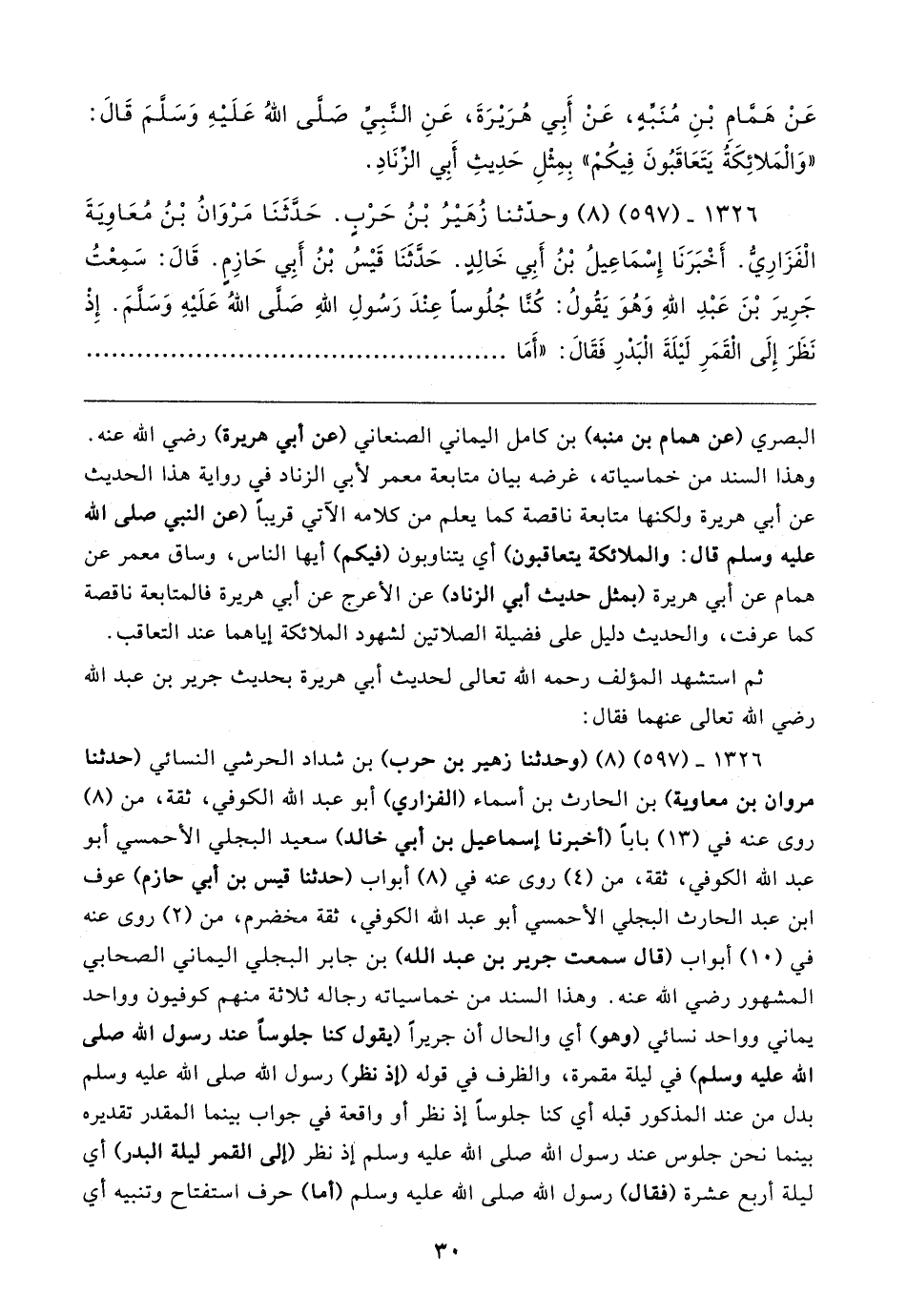 ١٣٢٦ - (٥٩٧) (٨) (وحدثنا زهير بن حرب) بن شداد الحرشي النسائي (حدثنا مروان بن معاوية) بن الحارث بن أسماء (الفزاري) أبو عبد الله الكوفي، ثقة، من (٨) روى عنه في (١٣) بابا (أخبرنا إسماعيل بن أبي خالد) سعيد البجلي الأحمسي أبو عبد الله الكوفي، ثقة، من (٤) روى عنه في (٨) أبواب (حدثنا قيس بن أبي حازم) عوف ابن عبد الحارث البجلي الأحمسي أبو عبد الله الكوفي، ثقة مخضرم، من (٢) روى عنه في (١٠) أبواب (قال سمعت جربر بن عبد الله) بن جابر البجلي اليماني الصحابي المشهور رضي الله عنه. وهذا السند من خماسياته رجاله ثلاثة منهم كوفيون وواحد يماني وواحد نسائي (وهو) أي والحال أن جريرًا (يقول كنا جلوسًا عند رسول الله صلى الله عليه وسلم) في ليلة مقمرة، والظرف في قوله (إذ نظر) رسول الله صلى الله عليه وسلم بدل من عند المذكور قبله أي كنا جلوسًا إذ نظر أو واقعة في جواب بينما المقدر تقديره بينما نحن جلوس عند رسول الله صلى الله عليه وسلم إذ نظر (إلى القمر ليلة البدر) أي ليلة أربع عشرة (فقال) رسول الله صلى الله عليه وسلم (أما) حرف استفتاح وتنبيه أي