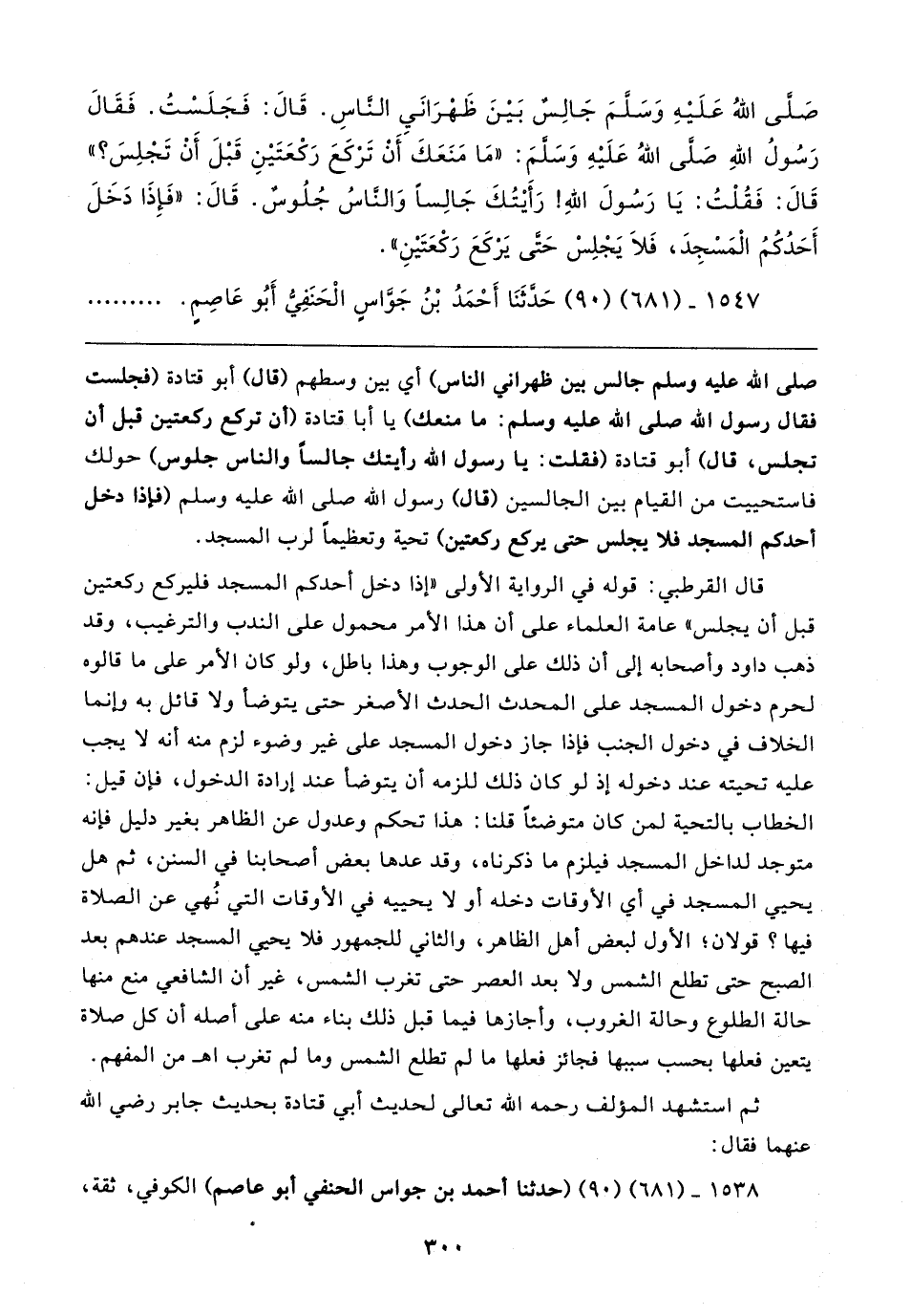 صَلى اللهُ عَلَيهِ وَسَلمَ جَالِس بَينَ ظَهْرَانَيِ الناسِ. قَال: فَجَلَسْتُ. فَقَال رَسُولُ اللهِ صَلى اللهُ عَلَيهِ وَسَلمَ: "مَا مَنَعَكَ أَنْ تركَعَ رَكْعَتَينِ قَبْلَ أَنْ تَجْلِسَ؟ " قَال: فَقُلْتُ: يَا رَسُولَ اللهِ! رَأيتُكَ جَالِسًا وَالناسُ جُلُوس. قَال: "فَإِذَا دَخَلَ أَحَدُكُمُ الْمَسْجِدَ، فَلَا يَجْلِسْ حَتى يَركَعَ رَكْعَتَين".