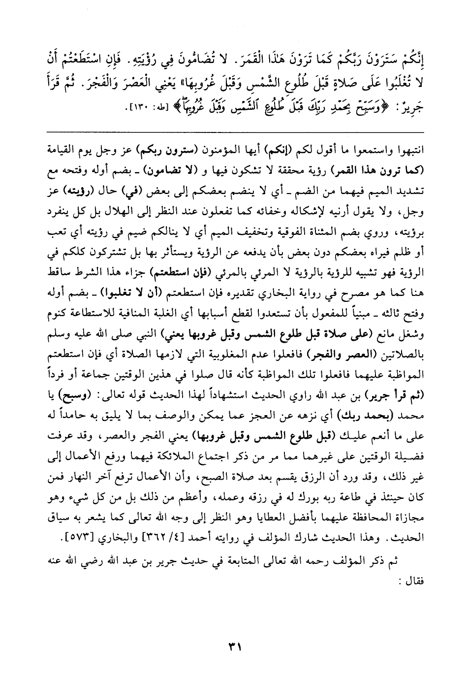 إِنكُمْ سَتَرَوْنَ رَبَّكُمْ كَمَا تَرَوْنَ هَذَا الْقَمَرَ. لا تُضَامُّونَ في رُؤْيَتِهِ. فَإِنِ استَطَعتُمْ أَنْ لا تُغْلَبُوا عَلَى صَلاةٍ قَبْلَ طُلُوعِ الشمْسِ وَقَبْلَ غُرُوبِهَا" يَعْنِي الْعَصرَ وَالْفَجْرَ. ثُم قَرَأَ جَرِيرٌ: {وَسَبِّحْ بِحَمْدِ رَبِّكَ قَبْلَ طُلُوعِ الشَّمْسِ وَقَبْلَ غُرُوبِهَا} [طه: ١٣٠]