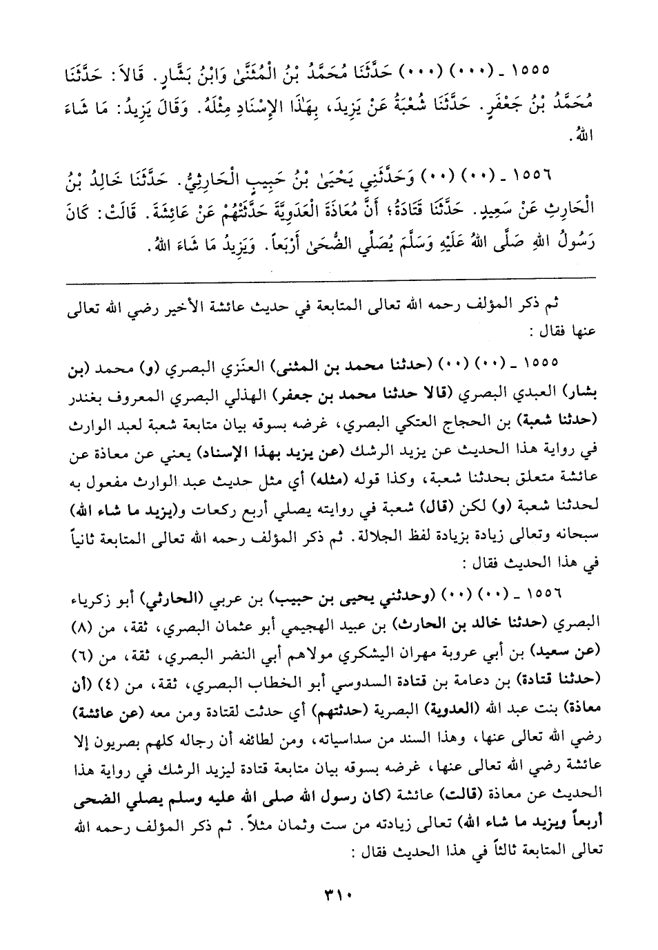 ١٥٥٦ - (٠٠) (٠٠) (وحدثني يحيى بن حبيب) بن عربي (الحارثي) أبو زكرياء البصري (حدثنا خالد بن الحارث) بن عبيد الهجيمي أبو عثمان البصري، ثقة، من (٨) (عن سعيد) بن أبي عروبة مهران اليشكري مولاهم أبي النضر البصري، ثقة، من (٦) (حدثنا قتادة) بن دعامة بن قتادة السدوسي أبو الخطاب البصري، ثقة، من (٤) (أن معاذة) بنت عبد الله (العدوية) البصرية (حدثتهم) أي حدثت لقتادة ومن معه (عن عائشة) رضي الله تعالى عنها، وهذا السند من سداسياته، ومن لطائفه أن رجاله كلهم بصريون إلا عائشة رضي الله تعالى عنها، غرضه بسوقه بيان متابعة قتادة ليزيد الرشك في رواية هذا الحديث عن معاذة (قالت) عائشة (كان رسول الله صلى الله عليه وسلم يصلي الضحى أربعًا ويزيد ما شاء الله) تعالى زيادته من ست وثمان مثلًا. ثم ذكر المؤلف رحمه الله تعالى المتابعة ثالثًا في هذا الحديث فقال: