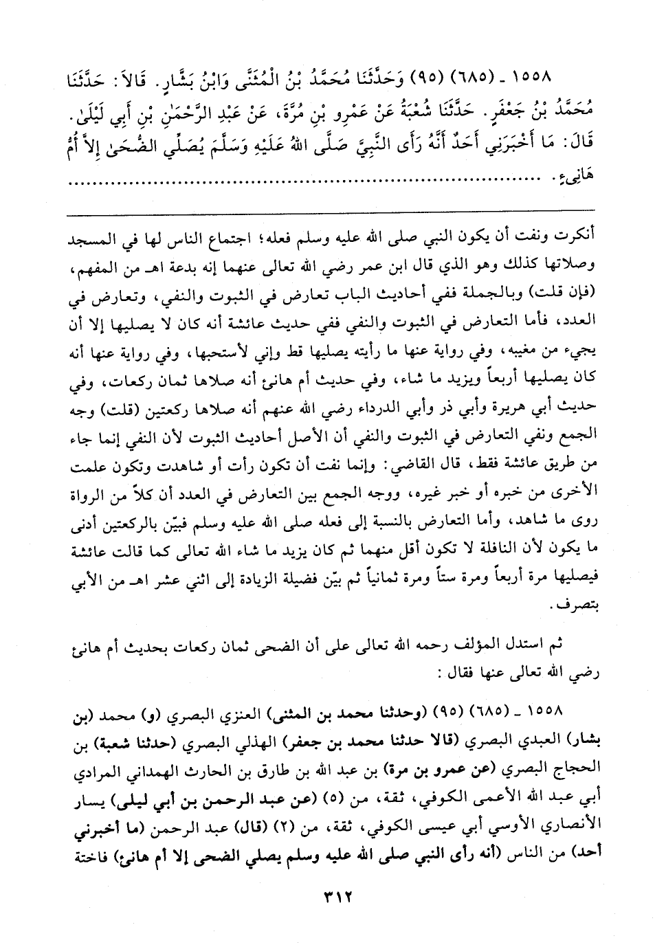 ١٥٥٨ - (٦٨٥) (٩٥) وَحَدّثَنَا مُحَمَّدُ بْنُ الْمُثَنَّى وَابْنُ بَشَّارٍ. قَالا: حَدَّثَنَا مُحَمَّدُ بْنُ جَعفَرٍ. حَدَّثَنَا شُعبَةُ عَنْ عَمرِو بْنِ مُرةَ، عَنْ عَبْدِ الرحمن بْنِ أَبِي لَيلى. قَال: مَا أَخْبَرَنِي أَحَدٌ أَنهُ رَأَى النَّبِي صَلَّى اللهُ عَلَيهِ وَسَلمَ يُصَلِّي الضحى إلَّا أُمُ هانِئٍ