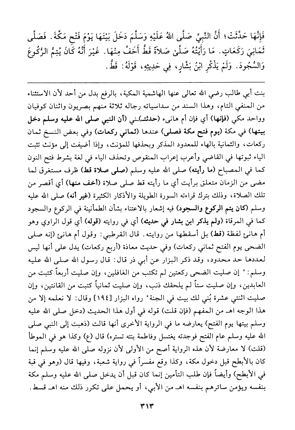 فَإِنَّهَا حَدَّثَتْ؛ أن النبِي صَلَّى اللهُ عَلَيهِ وَسَلَّمَ دَخَلَ بَيتَهَا يَوْمَ فَتْحِ مَكةَ. فَصَلَّى ثَمَانِيَ رَكَعَاتٍ. مَا رَأَيتُهُ صَلَّى صَلاةً قَطُّ أَخَفَّ مِنْهَا. غَيرَ أنَّهُ كَانَ يُتِمُّ الرُّكُوعَ وَالسُّجُودَ. وَلَمْ يَذْكُرِ ابْنُ بَشَّارٍ، فِي حَدِيثِهِ، قَوْلَهُ: قَطُّ