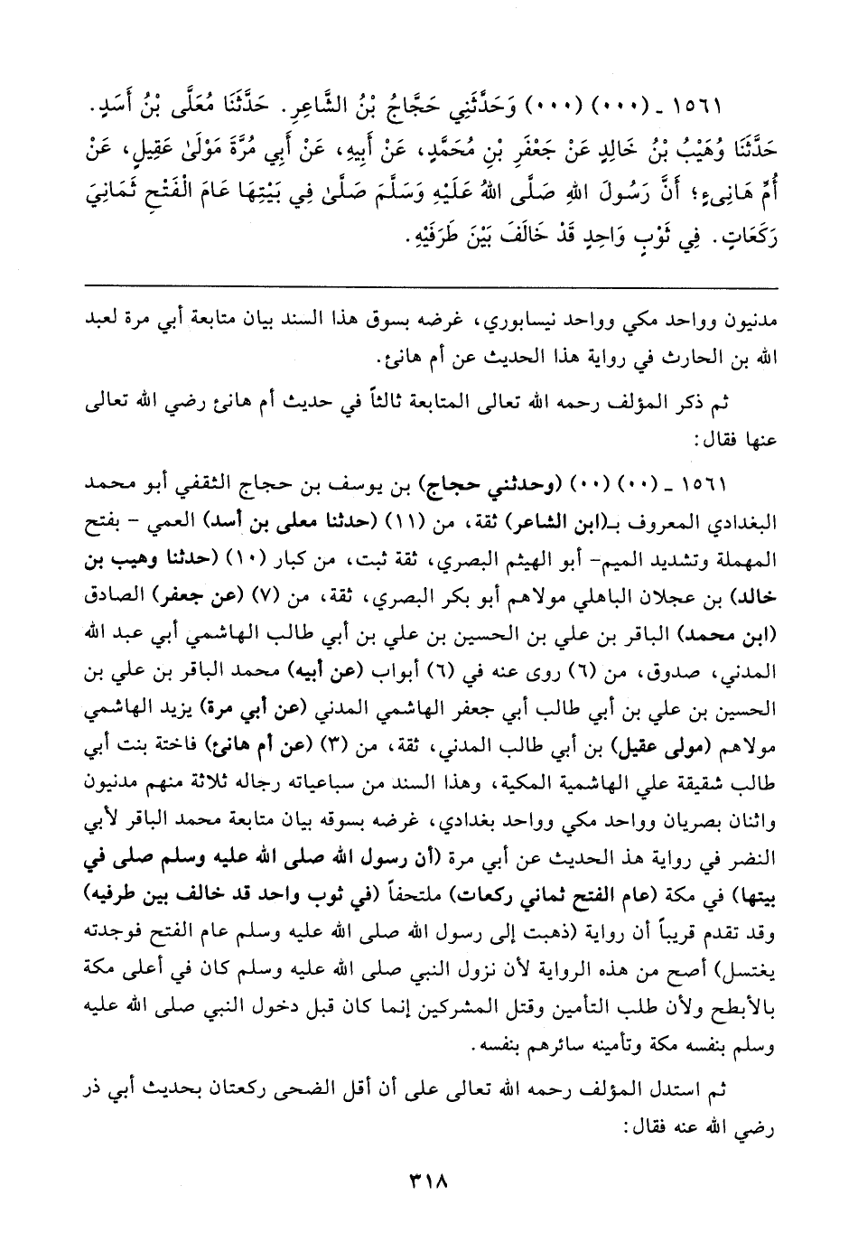 ١٥٦١ - (٠٠) (٠٠) وَحَدَّثَنِي حَجَّاجُ بْنُ الشَّاعِرِ. حَدَّثَنَا مُعَلَّى بْنُ أَسَدٍ. حَدَّثَنَا وُهَيبُ بْنُ خَالِدٍ عَنْ جَعْفَرِ بْنِ مُحَمَّدٍ، عَنْ أَبِيهِ، عَنْ أَبِي مُرَّةَ مَوْلَى عَقِيلٍ، عَنْ أُمِّ هَانِئٍ؛ أَنَّ رَسُولَ اللهِ صَلَّى اللهُ عَلَيهِ وَسَلَّمَ صَلَّى فِي بَيتِهَا عَامَ الْفَتْحِ ثَمَانِيَ رَكَعَاتٍ. فِي ثَوْبٍ وَاحِدٍ قَدْ خَالفَ بَينَ طَرَفَيهِ