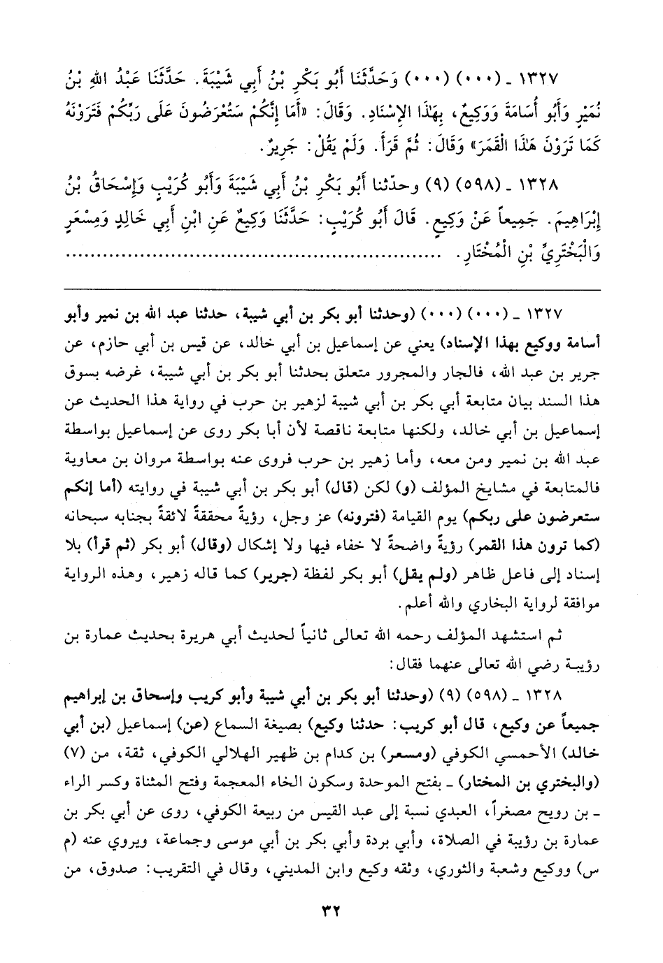 ١٣٢٧ - (٠٠) (٠٠) (وحدثنا أبو بكر بن أبي شببة، حدثنا عبد الله بن نمير وأبو أسامة ووكيع بهذا الإسناد) يعني عن إسماعيل بن أبي خالد، عن قيس بن أبي حازم، عن جرير بن عبد الله، فالجار والمجرور متعلق بحدثنا أبو بكر بن أبي شيبة، غرضه بسوق هذا السند بيان متابعة أبي بكر بن أبي شيبة لزهير بن حرب في رواية هذا الحديث عن إسماعيل بن أبي خالد، ولكنها متابعة ناقصة لأن أبا بكر روى عن إسماعيل بواسطة عبد الله بن نمير ومن معه، وأما زهير بن حرب فروى عنه بواسطة مروان بن معاوية فالمتابعة في مشايخ المؤلف (و) لكن (قال) أبو بكر بن أبي شيبة في روايته (أما إنكم ستعرضون على ربكم) يوم القيامة (فترونه) عزَّ وجلَّ، رؤيةً محققةً لائقةً بجنابه سبحانه (كما ترون هذا القمر) رؤيةً واضحةً لا خفاء فيها ولا إشكال (وقال) أبو بكر (ثم قرأ) بلا إسناد إلى فاعل ظاهر (ولم يقل) أبو بكر لفظة (جرير) كما قاله زهير، وهذه الرواية موافقة لرواية البخاري والله أعلم.