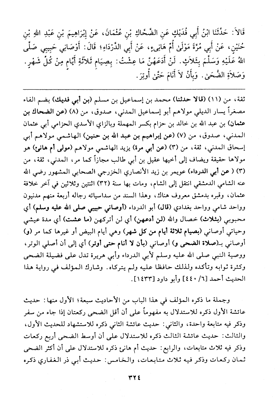 قَالا: حَدَّثَنَا ابْنُ أَبِي فُدَيكٍ عَنِ الضَّحَّاكِ بْنِ عُثْمَانَ، عَنْ إِبْرَاهِيمَ بْنِ عَبْدِ اللهِ بْنِ حُنَينٍ، عَنْ أَبِي مُرَّةَ مَوْلَى أُمِّ هَانِئٍ، عَنْ أَبِي الدَّرْدَاءِ؛ قَال: أَوْصَانِي حَبِيبِي صَلَّى اللهُ عَلَيهِ وَسَلَّمَ بِثَلاثٍ. لَنْ أَدَعَهُن مَا عِشْتُ: بِصِيَامِ ثَلاثَةِ أَيامٍ مِنْ كُل شَهْرٍ. وَصَلاةِ الضُّحَى. وَبِأَنْ لَا أَنَامَ حَتى أُوتِرَ