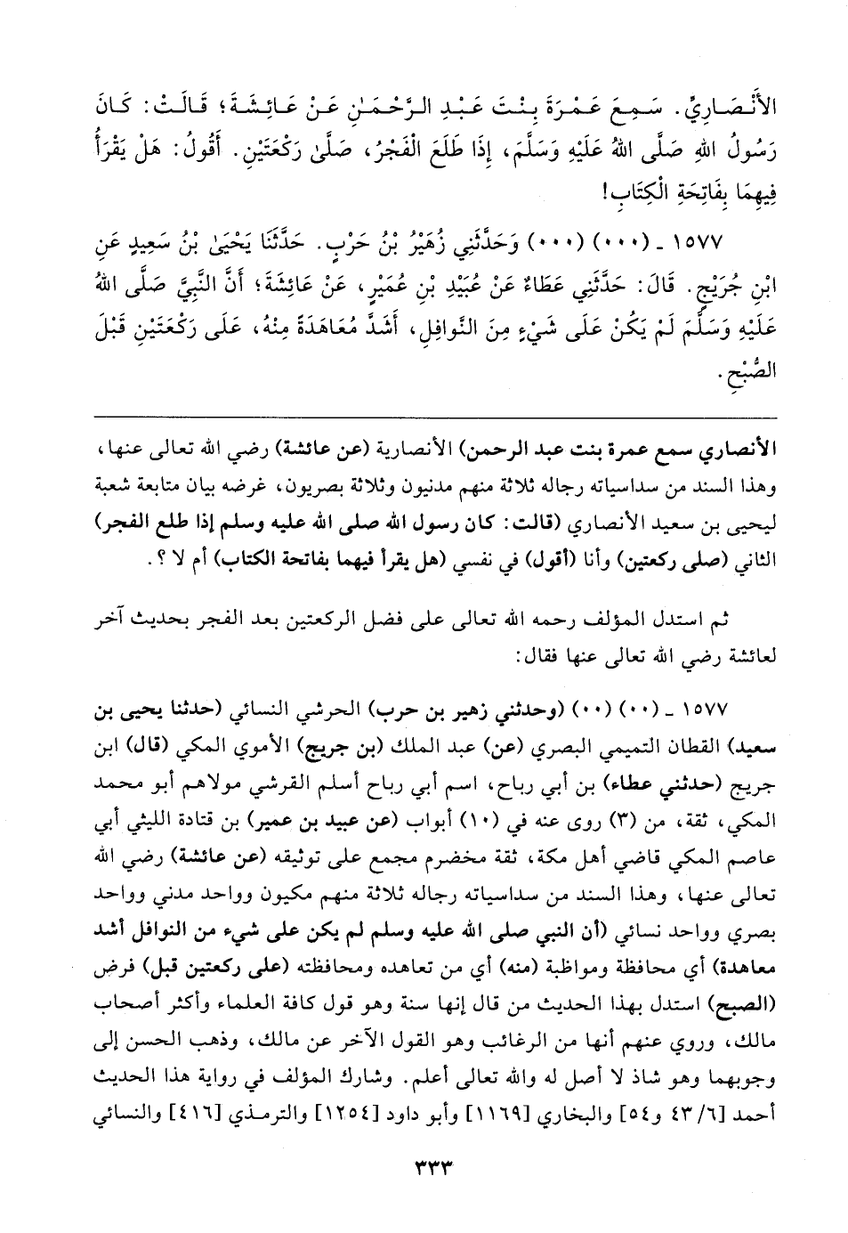 الأَنْصَارِيِّ. سَمِعَ عَمْرَةَ بِنْتَ عَبْدِ الرَّحْمَنِ عَنْ عَائِشَةَ؛ قَالتْ: كَانَ رَسُولُ اللهِ صَلَّى اللهُ عَلَيهِ وَسَلَمَ، إِذَا طَلَعَ الْفَجْرُ، صَلَّى رَكْعَتَينِ. أَقُولُ: هَلْ يَقْرَأُ فِيهِمَا بِفَاتِحَةِ الْكِتَابِ!
