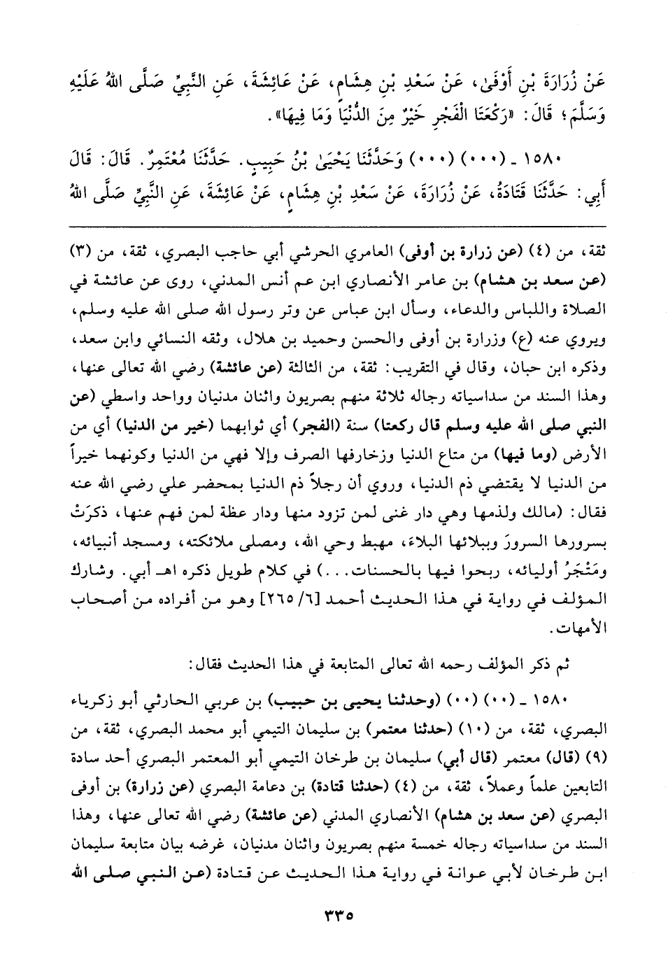 ١٥٨٠ - (٠٠) (٠٠) (وحدثنا يحيى بن حبيب) بن عربي الحارثي أبو زكرياء البصري، ثقة، من (١٠) (حدثنا معتمر) بن سليمان التيمي أبو محمد البصري، ثقة، من (٩) (قال) معتمر (قال أبي) سليمان بن طرخان التيمي أبو المعتمر البصري أحد سادة التابعين علما وعملا، ثقة، من (٤) (حدثنا قتادة) بن دعامة البصري (عن زرارة) بن أوفى البصري (عن سعد بن هشام) الأنصاري المدني (عن عائشة) رضي الله تعالى عنها، وهذا السند من سداسياته رجاله خمسة منهم بصريون واثنان مدنيان، غرضه بيان متابعة سليمان بن طرخان لأبي عوانة في رواية هذا الحديث عن قتادة (عن النبي صلى الله