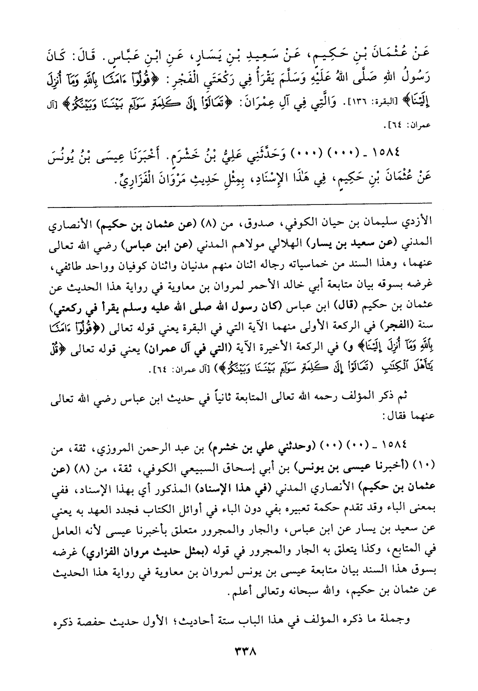 ١٥٨٤ - (٠٠) (٠٠) وَحَدَّثَنِي عَلِيُّ بْنُ خَشْرَمٍ. أَخْبَرَنَا عِيسَى بْنُ يُونُسَ عَنْ عُثْمَانَ بْنِ حَكِيمٍ، فِي هَذَا الإِسْنَادِ، بِمِثْلِ حَدِيثِ مَرْوَانَ الْفَزَارِيِّ