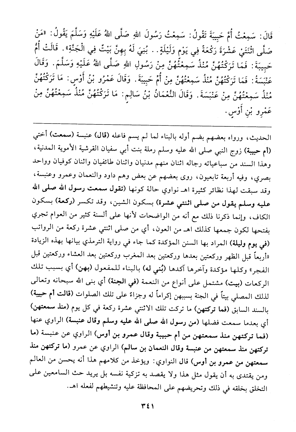 الحديث، ورواه بعضهم بضم أوله بالبناء لما لم يسم فاعله (قال) عنبسة (سمعت) أختي (أم حبيبة) زوج النبي صلى الله عليه وسلم رملة بنت أبي سفيان القرشية الأموية المدنية، وهذا السند من سباعياته رجاله اثنان منهم مدنيان واثنان طائفيان واثنان كوفيان وواحد بصري، وفيه أربعة تابعيون، روى بعضهم عن بعض وهم داود والنعمان وعمرو وعنبسة، وقد سبقت لهذا نظائر كثيرة اهـ نواوي حالة كونها (تقول سمعت رسول الله صلى الله عليه وسلم يقول من صلى اثنتي عشرة) بسكون الشين، وقد تكسر (ركعة) بسكون الكاف، وإنما ذكرنا ذلك مع أنه من الواضحات لأنها على ألسنة كثير من العوام تجري بفتحها لكون جمعها كذلك اهـ من العون، أي من صلى اثنتي عشرة ركعة من الرواتب (في يوم وليلة) المراد بها السنن المؤكدة كما جاء في رواية الترمذي بيانها بهذه الزيادة "أربعًا قبل الظهر وركعتين بعدها وركعتين بعد المغرب وركعتين بعد العشاء وركعتين قبل الفجر" وكلها مؤكدة وآخرها آكدها (بُني له) بالبناء للمفعول (بهن) أي بسبب تلك الركعات (بيت) مشتمل على أنواع من النعمة (في الجنة) أي بنى الله سبحانه وتعالى لذلك المصلي بيتًا في الجنة بسببهن إكرامًا له وجزاءً على تلك الصلوات (قالت أم حبيبة) بالسند السابق (فما تركتهن) ما تركت تلك الاثنتي عشرة ركعة في كل يوم (منذ سمعتهن) أي بعدما سمعت فضلها (من رسول الله صلى الله عليه وسلم وقال عنبسة) الراوي عنها (فما تركتهن منذ سمعتهن من أم حبيبة وقال عمرو بن أوس) الراوي عن عنبسة (ما تركتهن منذ سمعتهن من عنبسة وقال النعمان بن سالم) الراوي عن عمرو (ما تركتهن منذ سمعتهن من عمرو بن أوس) قال النواوي: ويؤخذ من كلامهم هذا أنه يحسن من العالم ومن يقتدى به أن يقول مثل هذا ولا يقصد به تزكية نفسه بل يريد حث السامعين على التخلق بخلقه في ذلك وتحريضهم على المحافظة عليه وتنشيطهم لفعله اهـ.