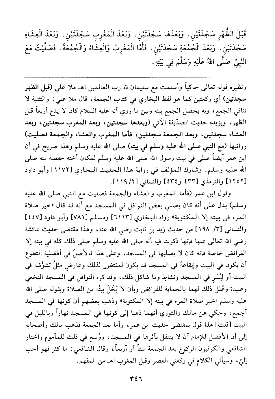 ونظيره قوله تعالى حاكيًا وأسلمت مع سليمان لله رب العالمين اهـ ملا علي (قبل الظهر سجدتين) أي ركعتين كما هو لفظ البخاري في كتاب الجمعة، قال ملا علي: والتثنية لا تنافي الجمع، وبه يحصل الجمع بينه وبين ما روي أنه - عليه السلام - كان لا يدع أربعًا قبل الظهر، ويؤيده حديث الصدّيقة الآتي (وبعدها سجدتين، وبعد المغرب سجدتين، وبعد العشاء سجدتين، وبعد الجمعة سجدتين، فأما المغرب والعشاء والجمعة فصليت) رواتبها (مع النبي صلى الله عليه وسلم في بيته) صلى الله عليه وسلم وهذا صريح في أن ابن عمر أيضًا صلى في بيت رسول الله صلى الله عليه وسلم لمكان أخته حفصة منه صلى الله عليه وسلم. وشارك المؤلف في رواية هذا الحديث البخاري [١١٧٢] وأبو داود [١٢٥٢] والترمذي [٤٣٣ و ٤٣٤] والنسائي [٢/ ١١٩].
