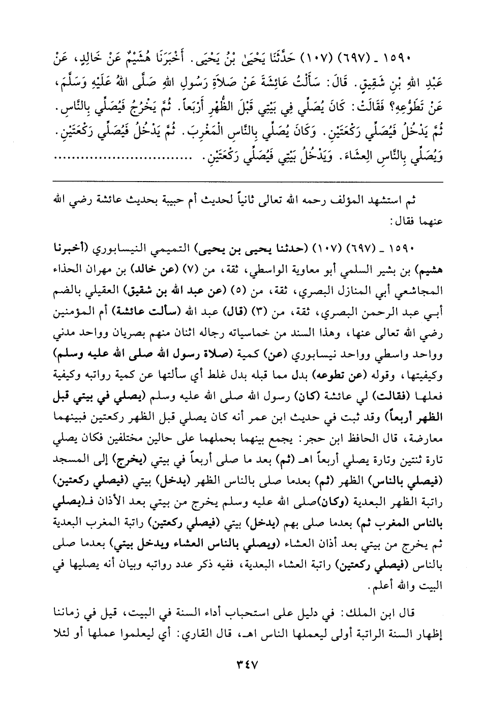 ١٥٩٠ - (٦٩٧) (١٠٧) (حدثنا يحيى بن يحيى) التميمي النيسابوري (أخبرنا هشيم) بن بشير السلمي أبو معاوية الواسطي، ثقة، من (٧) (عن خالد) بن مهران الحذاء المجاشعي أبي المنازل البصري، ثقة، من (٥) (عن عبد الله بن شقيق) العقيلي بالضم أبي عبد الرحمن البصري، ثقة، من (٣) (قال) عبد الله (سألت عائشة) أم المؤمنين رضي الله تعالى عنها، وهذا السند من خماسياته رجاله اثنان منهم بصريان وواحد مدني وواحد واسطي وواحد نيسابوري (عن) كمية (صلاة رسول الله صلى الله عليه وسلم) وكيفيتها، وقوله (عن تطوعه) بدل مما قبله بدل غلط أي سالتها عن كمية رواتبه وكيفية فعلها (فقالت) لي عائشة (كان) رسول الله صلى الله عليه وسلم (يصلي في بيتي قبل الظهر أربعًا) وقد ثبت في حديث ابن عمر أنه كان يصلي قبل الظهر ركعتين فبينهما معارضة، قال الحافظ ابن حجر: يجمع بينهما بحملهما على حالين مختلفين فكان يصلي تارة ثنتين وتارة يصلي أربعًا اهـ (ثم) بعد ما صلى أربعًا في بيتي (يخرج) إلى المسجد (فيصلي بالناس) الظهر (ثم) بعدما صلى بالناس الظهر (يدخل) بيتي (فيصلي ركعتين) راتبة الظهر البعدية (وكان) صلى الله عليه وسلم يخرج من بيتي بعد الأذان فـ (يصلي بالناس المغرب ثم) بعدما صلى بهم (يدخل) بيتي (فيصلي ركعتين) راتبة المغرب البعدية ثم يخرج من بيتي بعد أذان العشاء (ويصلي بالناس العشاء وبدخل بيتي) بعدما صلى بالناس (فيصلي ركعتين) راتبة العشاء البعدية، ففيه ذكر عدد رواتبه وبيان أنه يصليها في البيت والله أعلم.