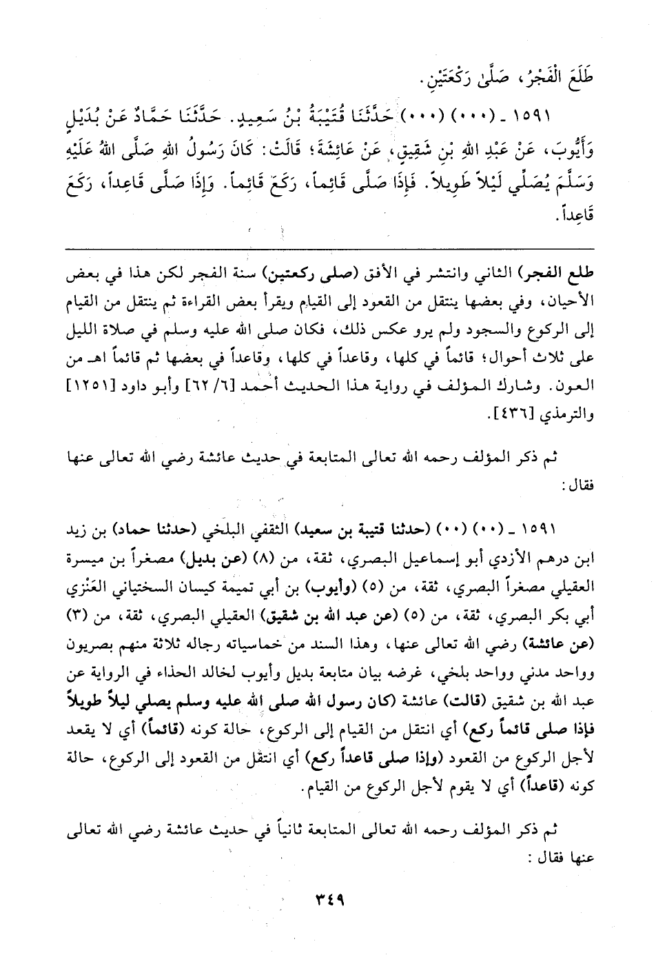 ١٥٩١ - (٠٠) (٠٠) حَدَّثَنَا قُتَيبَةُ بْنُ سَعِيدٍ. حَدَّثَنَا حَمَّادٌ عَنْ بُدَيلٍ وَأَيُّوبَ، عَنْ عَبْدِ اللهِ بْنِ شَقِيقٍ، عَنْ عَائِشَةَ؛ قَالتْ: كَانَ رَسًول اللهِ صَلَّى اللهُ عَلَيهِ وَسَلَّمَ يُصَلِّي لَيلًا طَويلًا. فَإِذَا صَلَّى قَائِمًا، رَكَعَ قَائِمًا. وَإِذَا صَلَّى قَاعِدًا، رَكَعَ قَاعِدًا