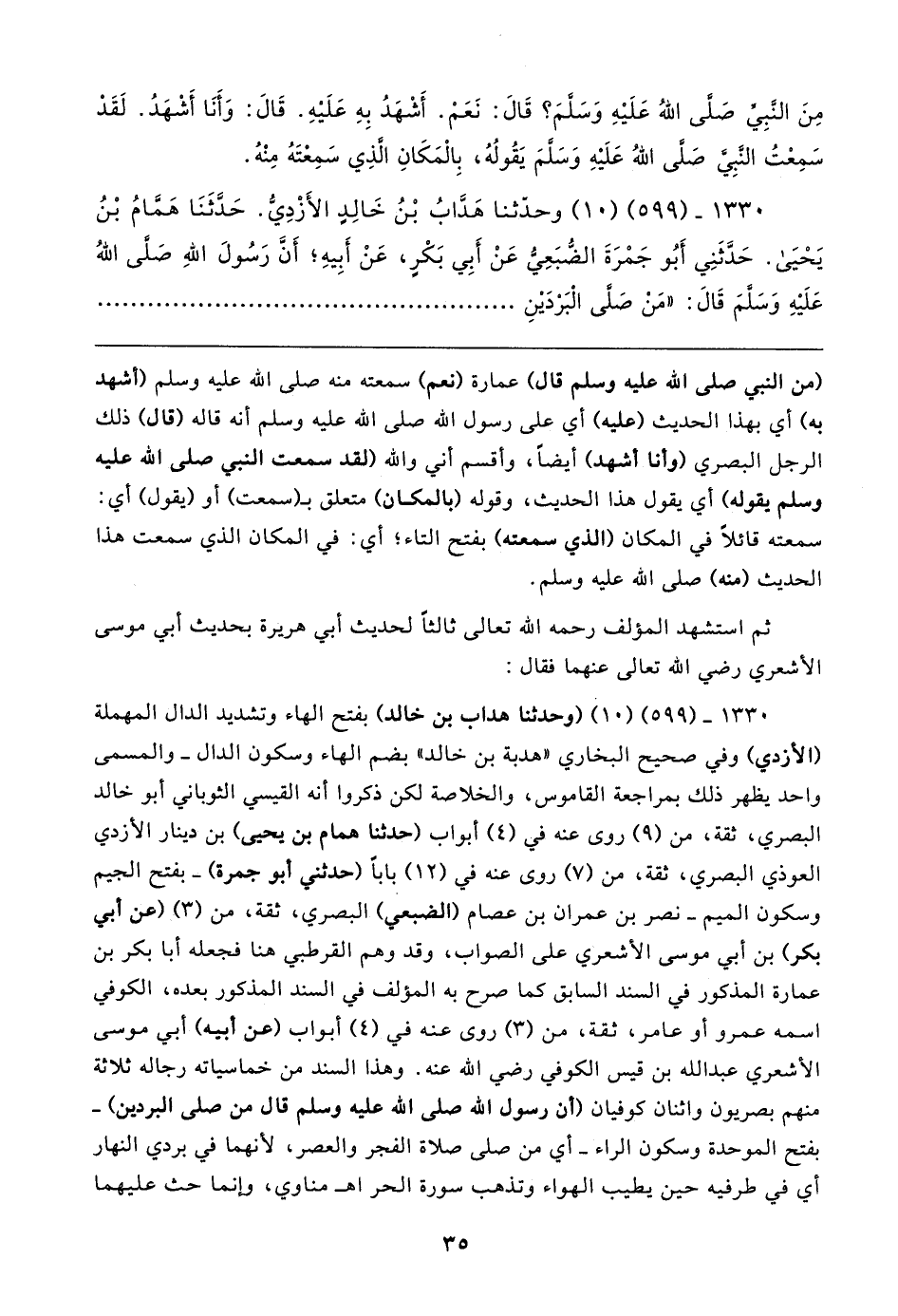 ١٣٣٠ - (٥٩٩) (١٠) وحدثنا هداب بن خالد) بفتح الهاء وتشديد الدال المهملة (الأزدي) وفي صحيح البخاري "هدبة بن خالد" بضم الهاء وسكون الدال - والمسمى واحد يظهر ذلك بمراجعة القاموس، والخلاصة لكن ذكروا أنه القيسي الثوباني أبو خالد البصري، ثقة، من (٩) روى عنه في (٤) أبواب (حدثنا همام بن يحيى) بن دينار الأزدي العوذي البصري، ثقة، من (٧) روى عنه في (١٢) بابا (حدثني أبو جمرة) -بفتح الجيم وسكون الميم- نصر بن عمران بن عصام (الضبعي) البصري، ثقة، من (٣) (عن أبي بكر) بن أبي موسى الأشعري على الصواب، وقد وهم القرطبي هنا فجعله أبا بكر بن عمارة المذكور في السند السابق كما صرح به المؤلف في السند المذكور بعده، الكوفي اسمه عمرو أو عامر، ثقة، من (٣) روى عنه في (٤) أبواب (عن أبيه) أبي موسى الأشعري عبد الله بن قيس الكوفي رضي الله عنه. وهذا السند من خماسياته رجاله ثلاثة منهم بصريون واثنان كوفيان (أن رسول الله صلى الله عليه وسلم قال من صلى البردين) - بفتح الموحدة وسكون الراء -أي من صلى صلاة الفجر والعصر، لأنهما في بردي النهار أي في طرفيه حين يطيب الهواء وتذهب سورة الحر اهـ مناوي، وإنما حث عليهما