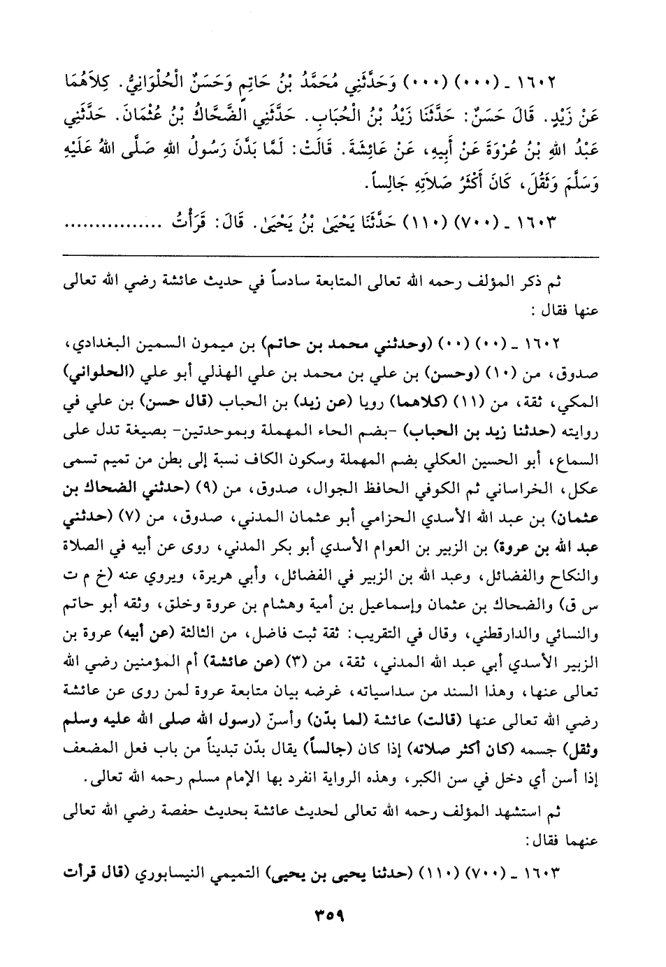 ١٦٠٢ - (٠٠) (٠٠) (وحدثني محمد بن حاتم) بن ميمون السمين البغدادي، صدوق، من (١٠) (وحسن) بن علي بن محمد بن علي الهذلي أبو علي (الحلواني) المكي، ثقة، من (١١) (كلاهما) رويا (عن زيد) بن الحباب (قال حسن) بن علي في روايته (حدثنا زيد بن الحباب) -بضم الحاء المهملة وبموحدتين- بصيغة تدل على السماع، أبو الحسين العكلي بضم المهملة وسكون الكاف نسبة إلى بطن من تميم تسمى عكل، الخراساني ثم الكوفي الحافظ الجوال، صدوق، من (٩) (حدثني الضحاك بن عثمان) بن عبد الله الأسدي الحزامي أبو عثمان المدني، صدوق، من (٧) (حدثني عبد الله بن عروة) بن الزبير بن العوام الأسدي أبو بكر المدني، روى عن أبيه في الصلاة والنكاح والفضائل، وعبد الله بن الزبير في الفضائل، وأبي هريرة، ويروي عنه (خ م ت س ق) والضحاك بن عثمان وإسماعيل بن أمية وهشام بن عروة وخلق، وثقه أبو حاتم والنسائي والدارقطني، وقال في التقريب: ثقة ثبت فاضل، من الثالثة (عن أبيه) عروة بن الزبير الأسدي أبي عبد الله المدني، ثقة، من (٣) (عن عائشة) أم المؤمنين رضي الله تعالى عنها، وهذا السند من سداسياته، غرضه بيان متابعة عروة لمن روى عن عائشة رضي الله تعالى عنها (قالت) عائشة (لما بدّن) وأسنّ (رسول الله صلى الله عليه وسلم وثقل) جسمه (كان أكثر صلاته) إذا كان (جالسًا) يقال بدّن تبدينًا من باب فعل المضعف إذا أسن أي دخل في سن الكبر، وهذه الرواية انفرد بها الإمام مسلم رحمه الله تعالى.