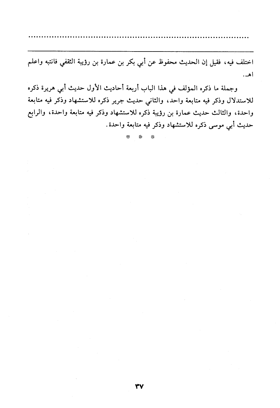 وجملة ما ذكره المؤلف في هذا الباب أربعة أحاديث الأول حديث أبي هريرة ذكره للاستدلال وذكر فيه متابعة واحد، والثاني حديث جرير ذكره للاستشهاد وذكر فيه متابعة واحدة، والثالث حديث عمارة بن رؤيبة ذكره للاستشهاد وذكر فيه متابعة واحدة، والرابع حديث أبي موسى ذكره للاستشهاد وذكر فيه متابعة واحدة.