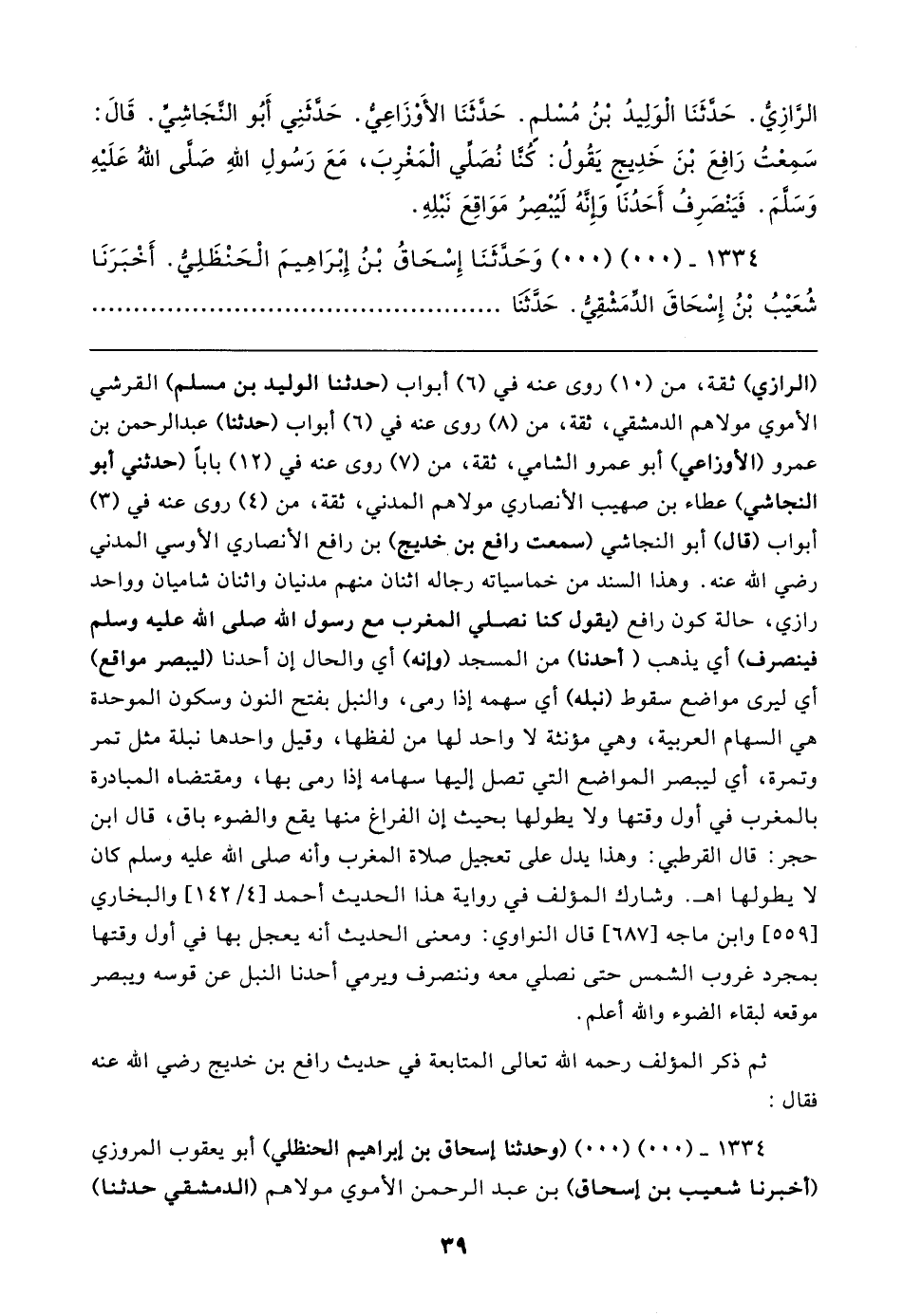 (الرازي) ثقة، من (١٠) روى عنه في (٦) أبواب (حدثنا الوليد بن مسلم) القرشي الأموي مولاهم الدمشقي، ثقة، من (٨) روى عنه في (٦) أبواب (حدثنا) عبد الرحمن بن عمرو (الأوزاعي) أبو عمرو الشامي، ثقة، من (٧) روى عنه في (١٢) بابا (حدثني أبو النجاشي) عطاء بن صهيب الأنصاري مولاهم المدني، ثقة، من (٤) روى عنه في (٣) أبواب (قال) أبوالنجاشي (سمعت رافع بن خديج) بن رافع الأنصاري الأوسي المدني رضي الله عنه. وهذا السند من خماسياته رجاله اثنان منهم مدنيان واثنان شاميان وواحد رازي، حالة كون رافع (يقول كنا نصلي المغرب مع رسول الله صلى الله عليه وسلم فينصرف) أي يذهب (أحدنا) من المسجد (وإنه) أي والحال إن أحدنا (ليبصر مواقع) أي ليرى مواضع سقوط (نبله) أي سهمه إذا رمى، والنبل بفتح النون وسكون الموحدة هي السهام العربية، وهي مؤنثة لا واحد لها من لفظها، وقيل واحدها نبلة مثل تمر وتمرة، أي ليبصر المواضع التي تصل إليها سهامه إذا رمى بها، ومقتضاه المبادرة بالمغرب في أول وقتها ولا يطولها بحيث إن الفراغ منها يقع والضوء باق، قال ابن حجر: قال القرطبي: وهذا يدل على تعجيل صلاة المغرب وأنه صلى الله عليه وسلم كان لا يطولها اهـ. وشارك المؤلف في رواية هذا الحديث أحمد [٤/ ١٤٢] والبخاري [٥٥٩]، وابن ماجه [٦٨٧]، قال النواوي: ومعنى الحديث أنه يعجل بها في أول وقتها بمجرد غروب الشمس حتى نصلي معه وننصرف ويرمي أحدنا النبل عن قوسه ويبصر موقعه لبقاء الضوء والله أعلم.